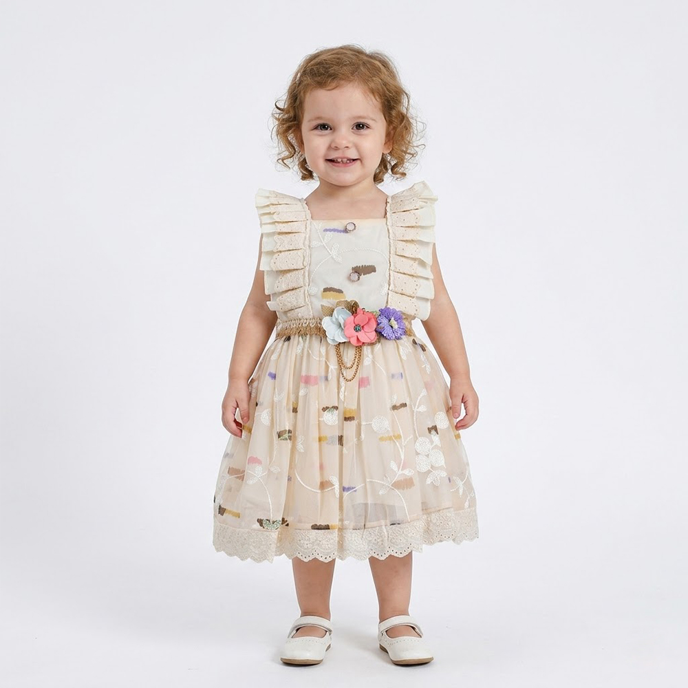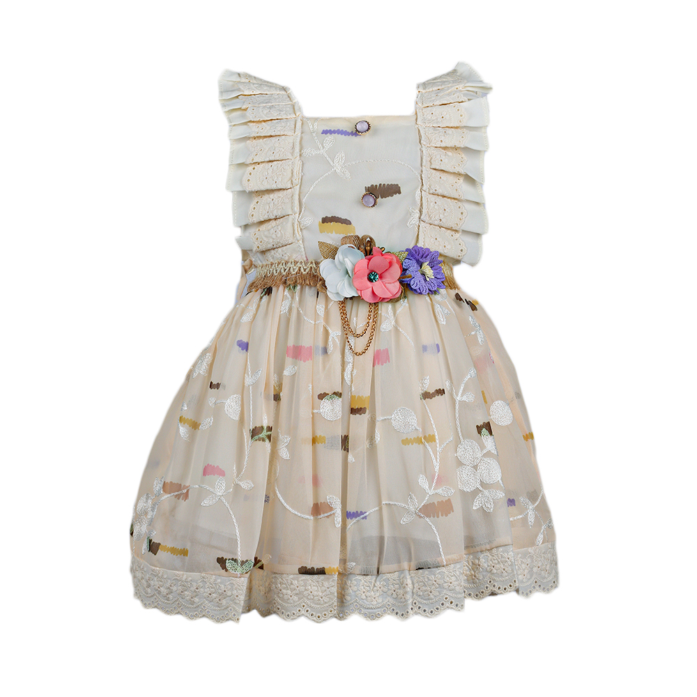 فستان بناتي مبطن من الداخل ، و بكسرات متصلة من الأمام الى الخلف ، ازرار على الصدر ، حزام مزين بالورد على الخصر ، و كسرات خفيفة على الخصر لقصة تنورة واسعة