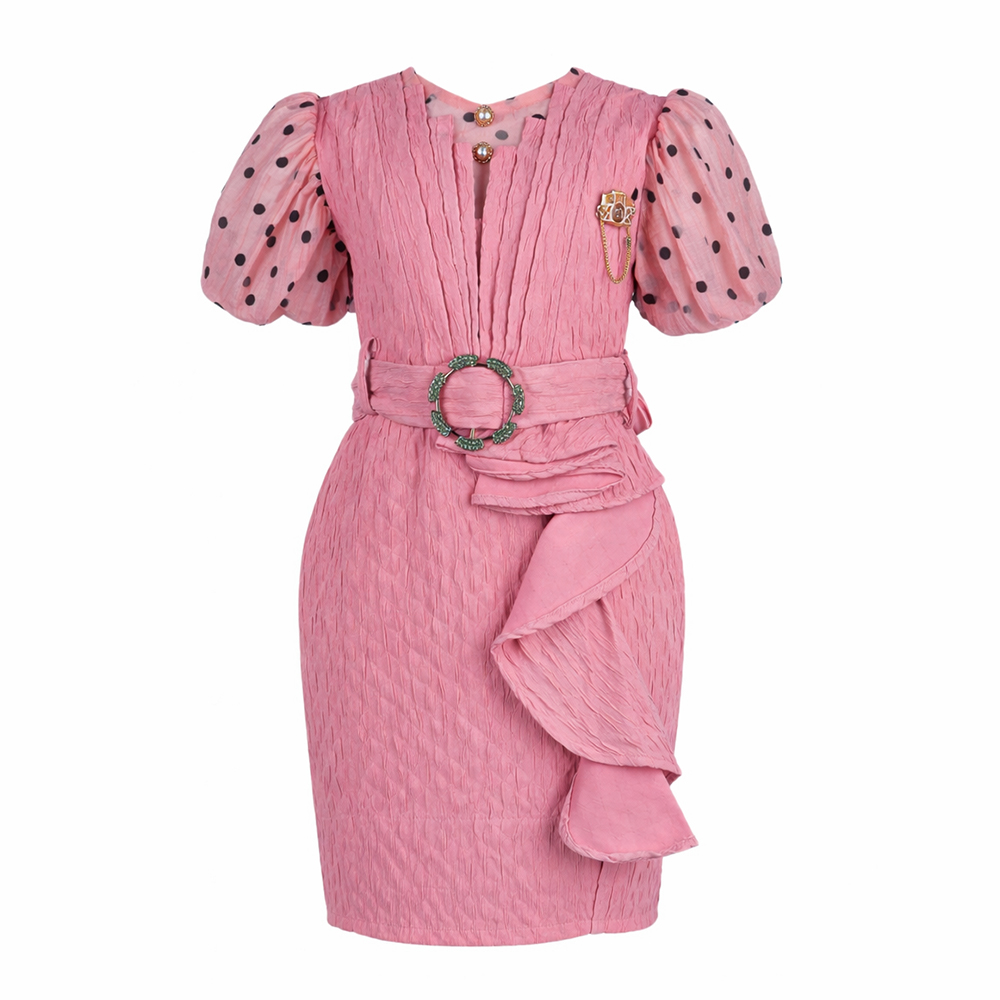 فستان بناتي بأكمام منفوخة ذات كسرات أنيقة ، ايضاً كسرات على الصدر ، وحزام على الخصر .