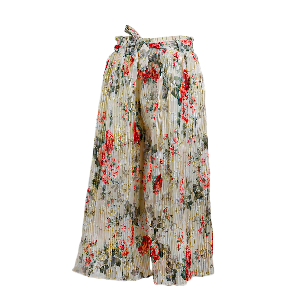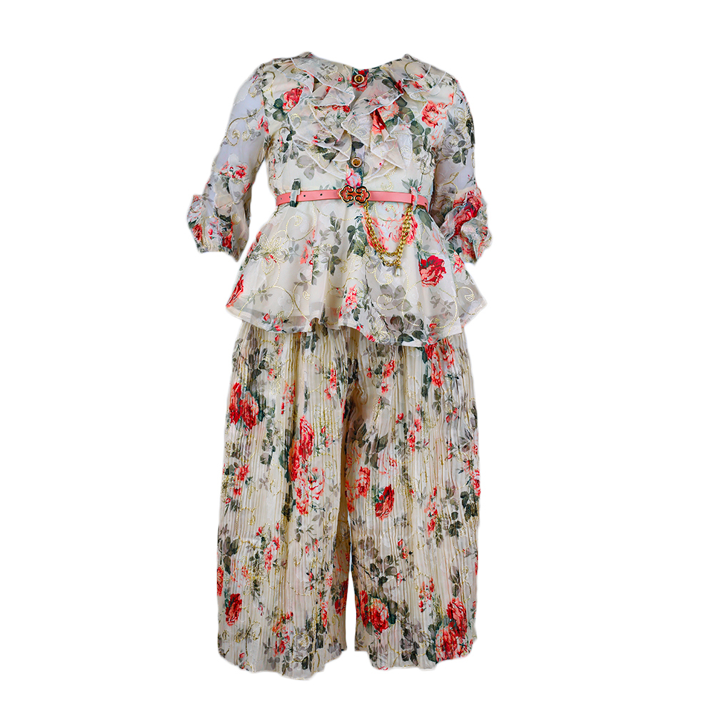 طقم بناتي أنيق مكون من بلوزة ذات كشاكش على الصدر ، بأكمام حيران ، حزام جلد على الخصر ، و بنطلون كسرات صغيرة لقصة بنطلون واسعة .