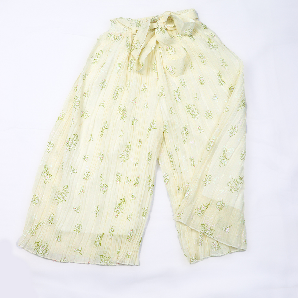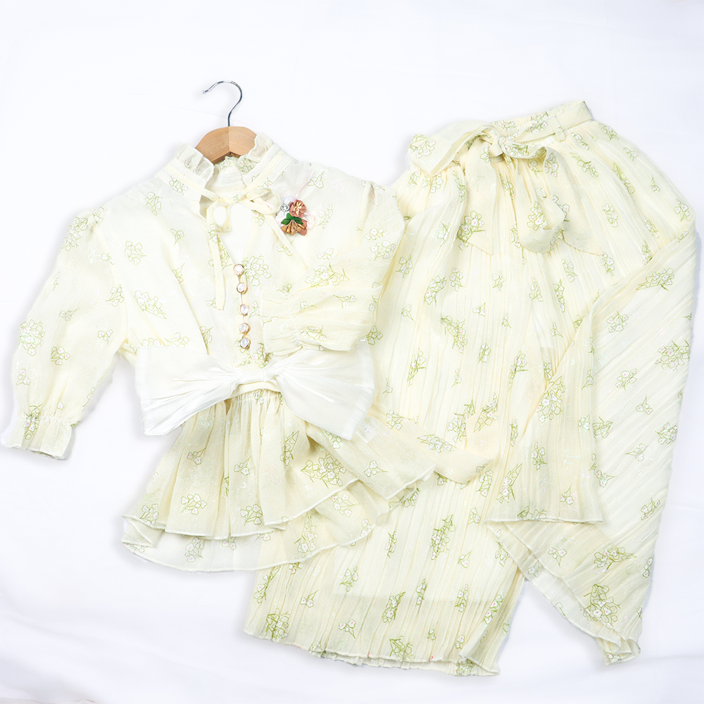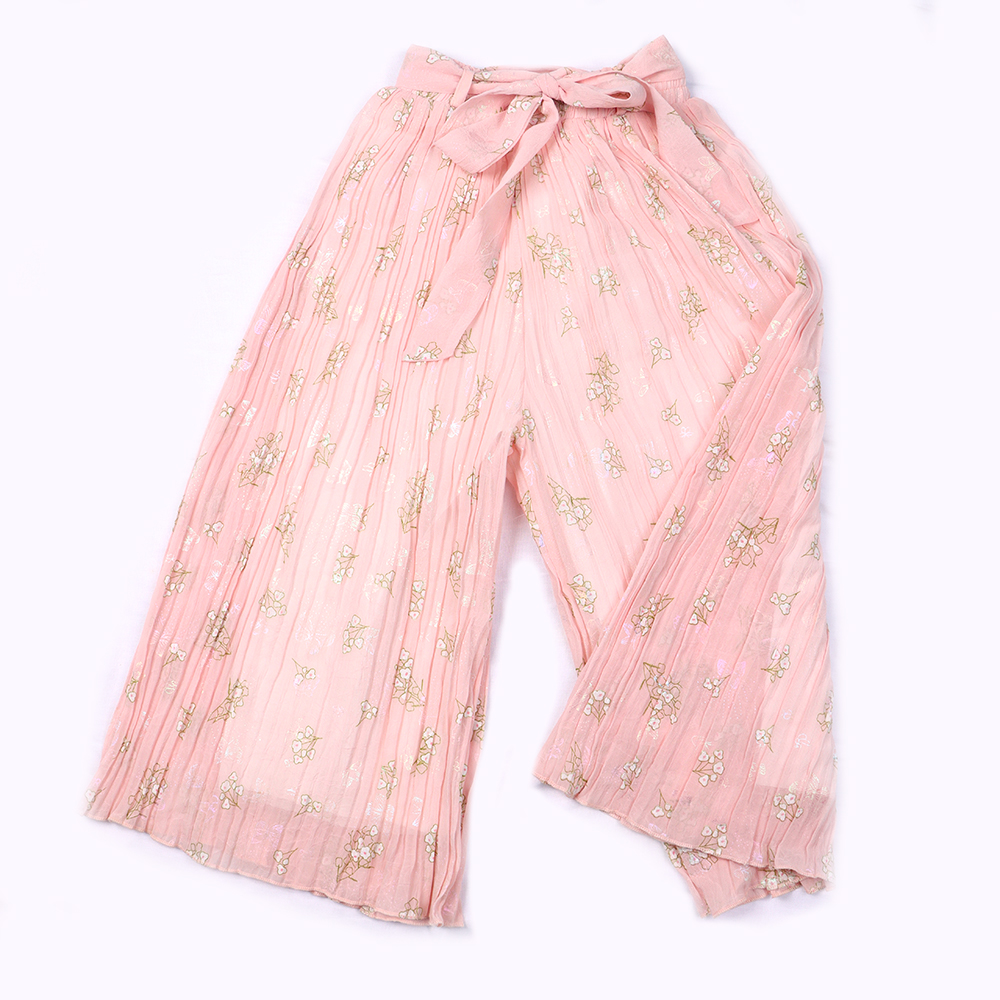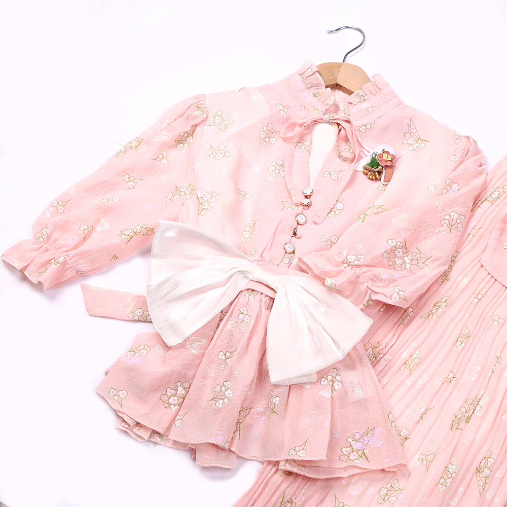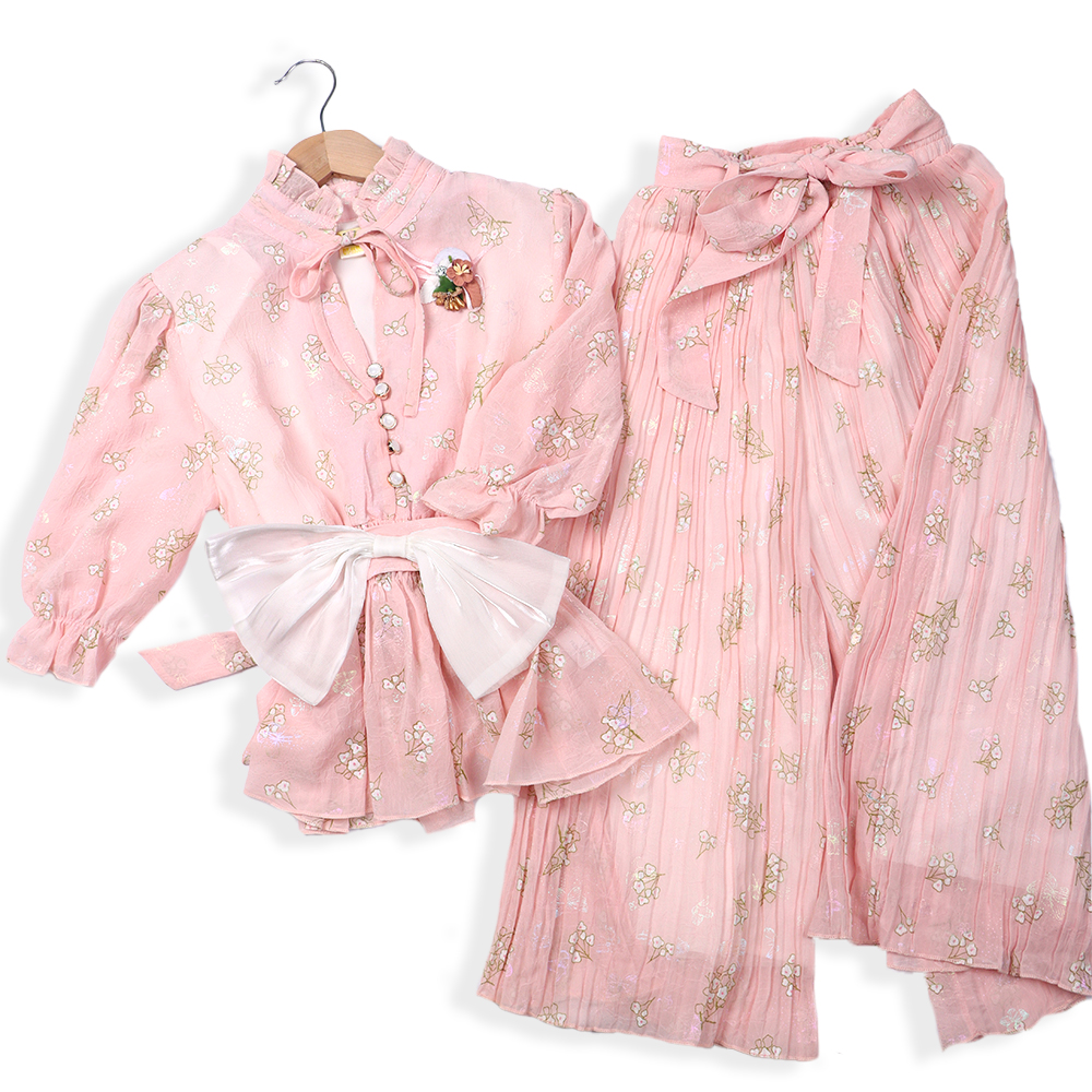 طقم بناتي أنيق مكون من بلوزة بأزرار على الصدر ، أكمام حيران ، مزين بفيونكة على الخصر ، و بنطلون بكسرات لقصة واسعة .