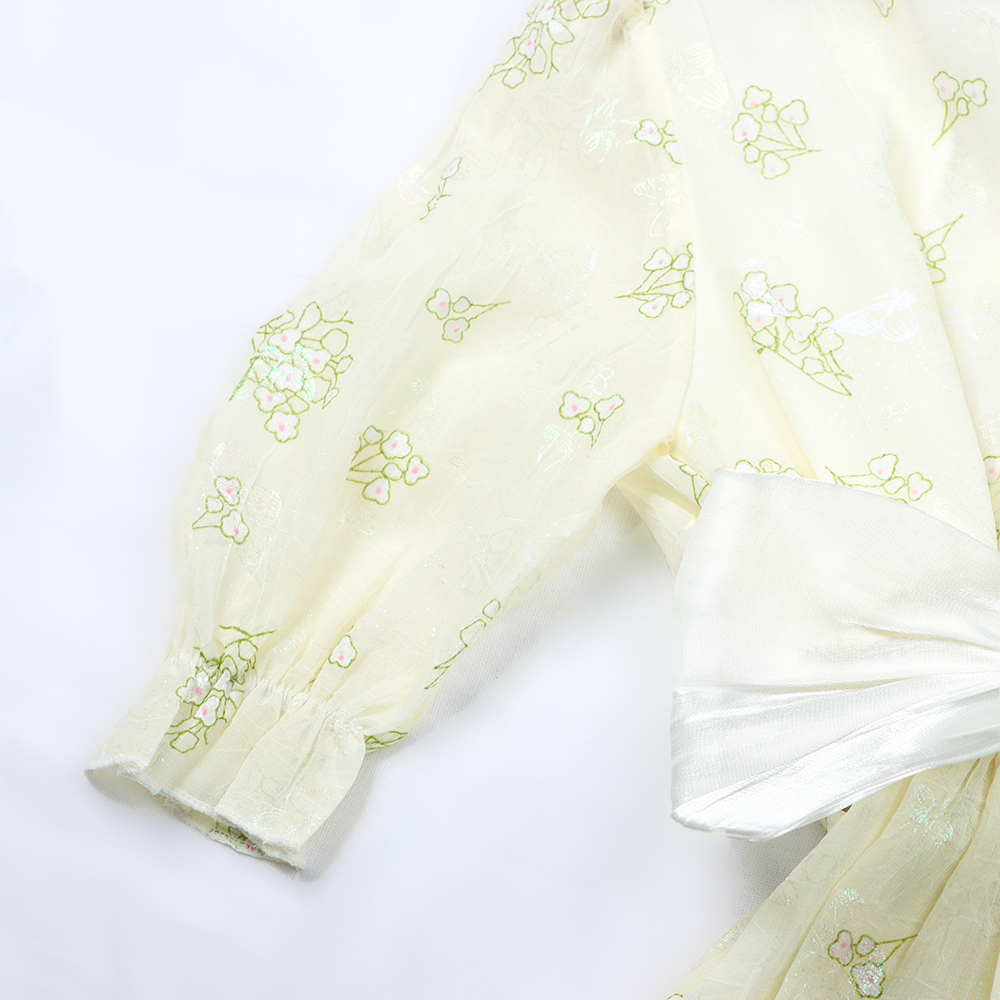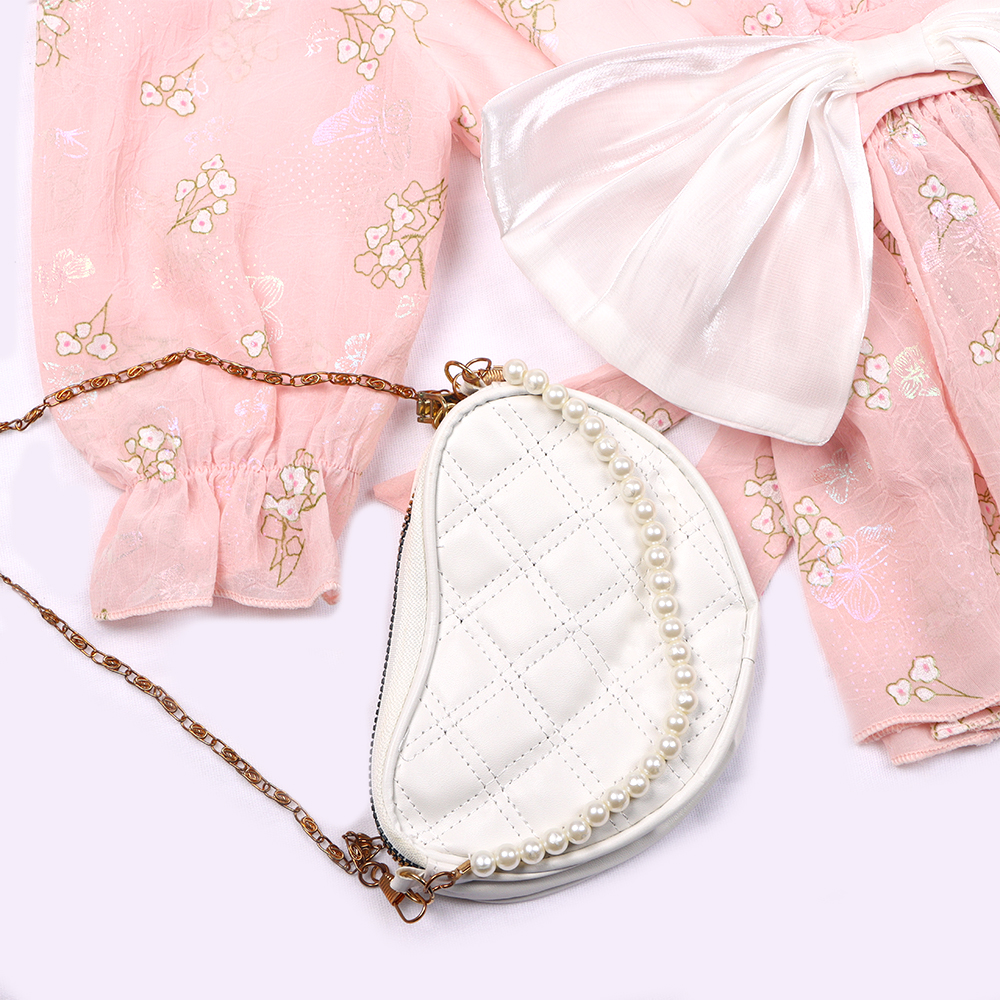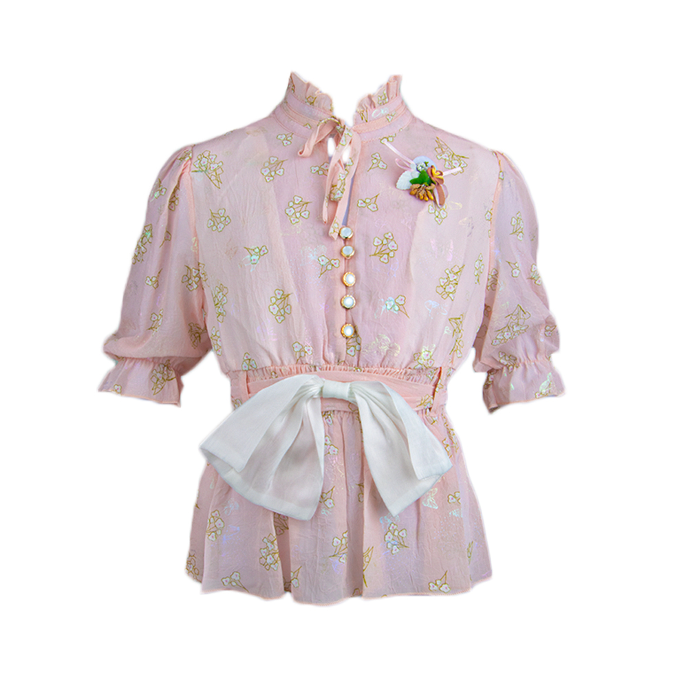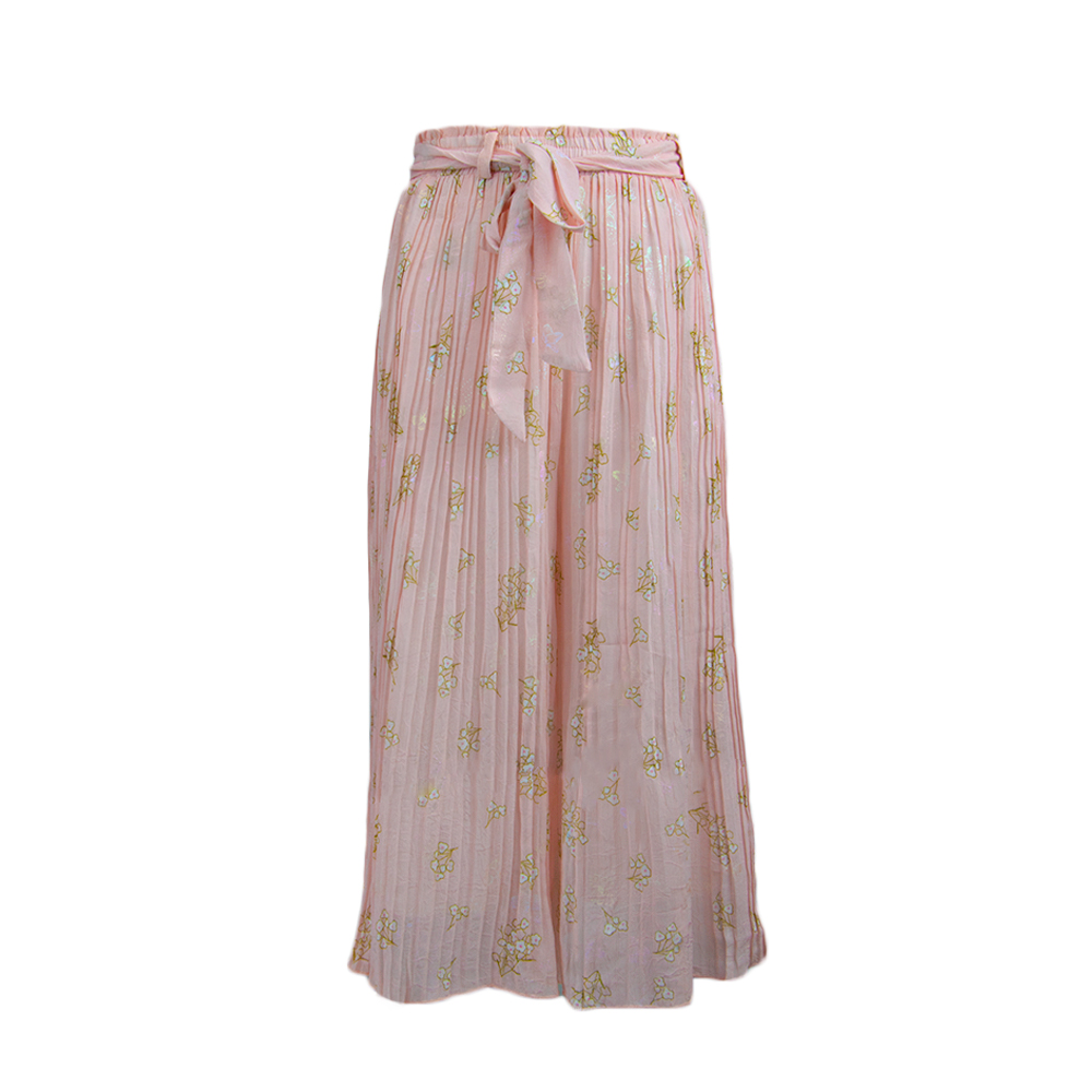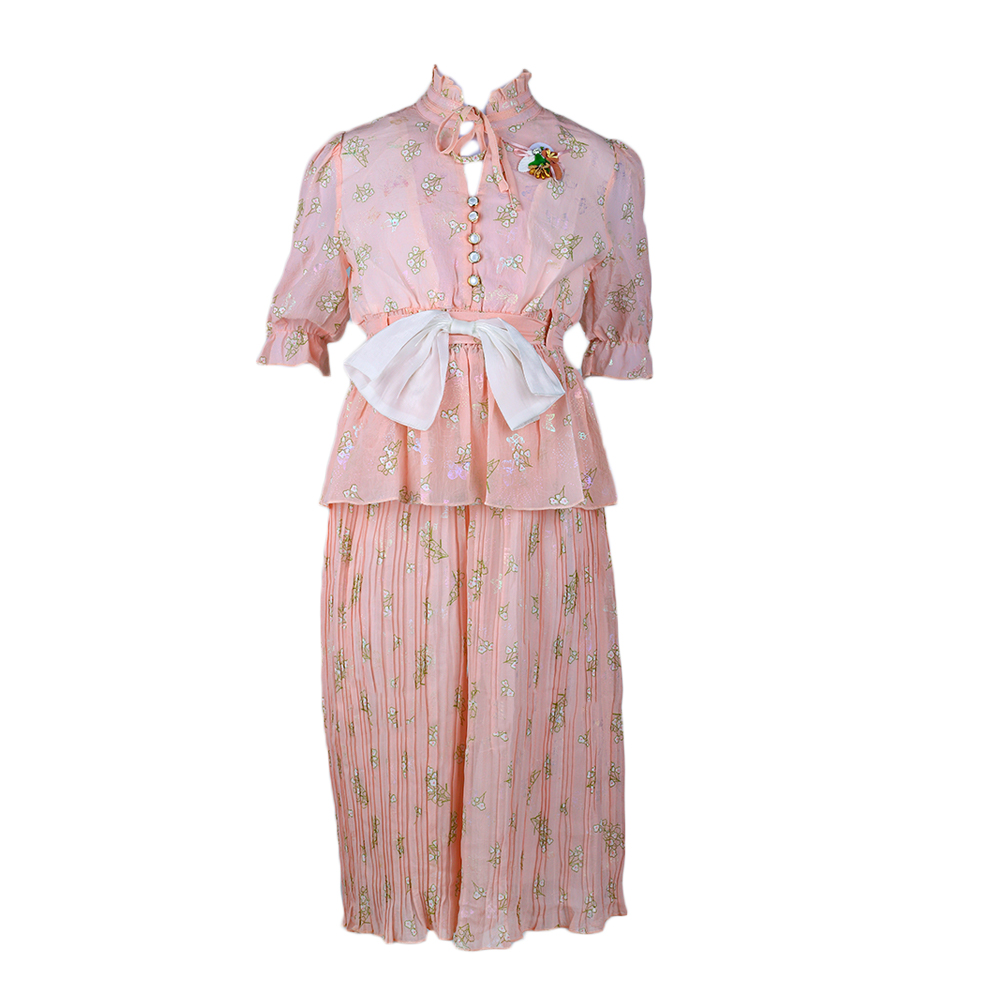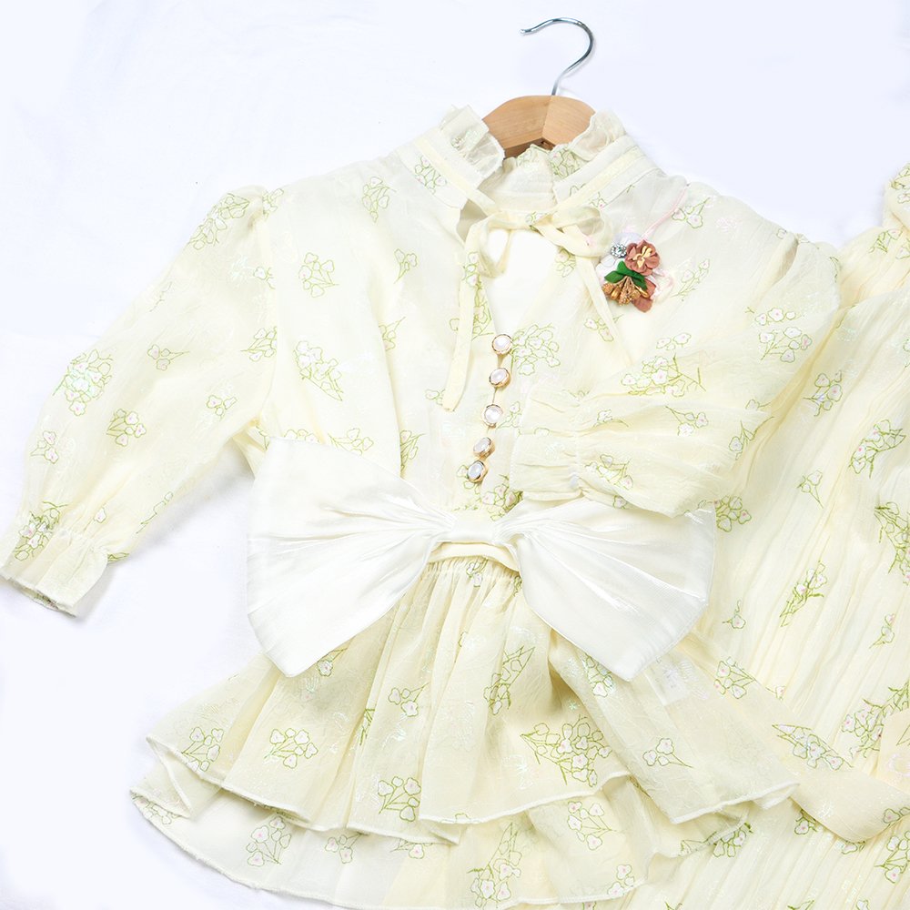 طقم بناتي أنيق مكون من بلوزة بأزرار على الصدر ، أكمام حيران ، مزين بفيونكة على الخصر ، و بنطلون بكسرات لقصة واسعة .