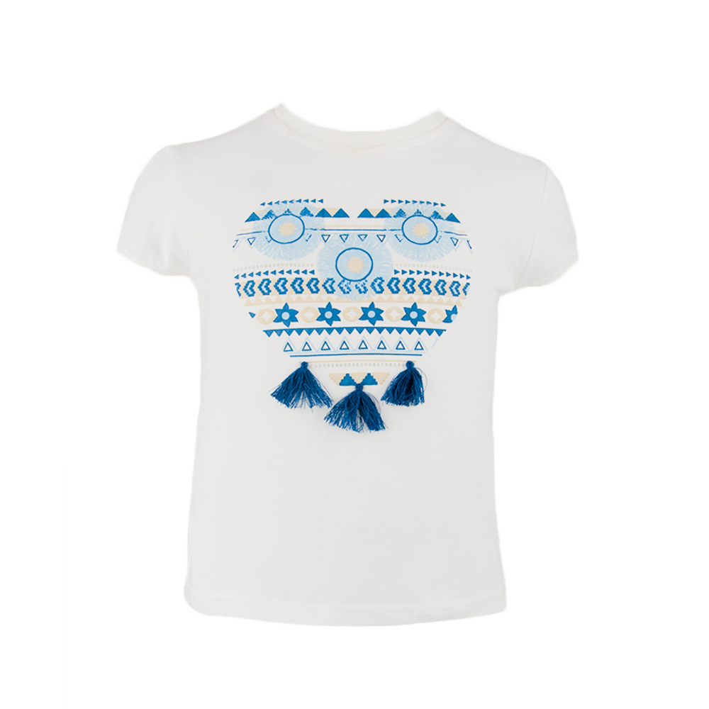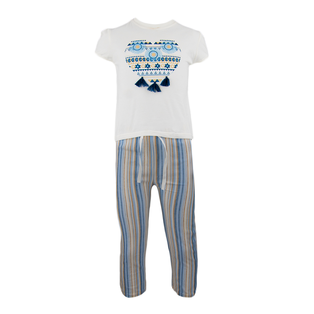 بجامة بناتي قطن بأكمام قصيرة ، و رسمة شكل في منتصف الصدر ، وبنطلون طويل مخطط .