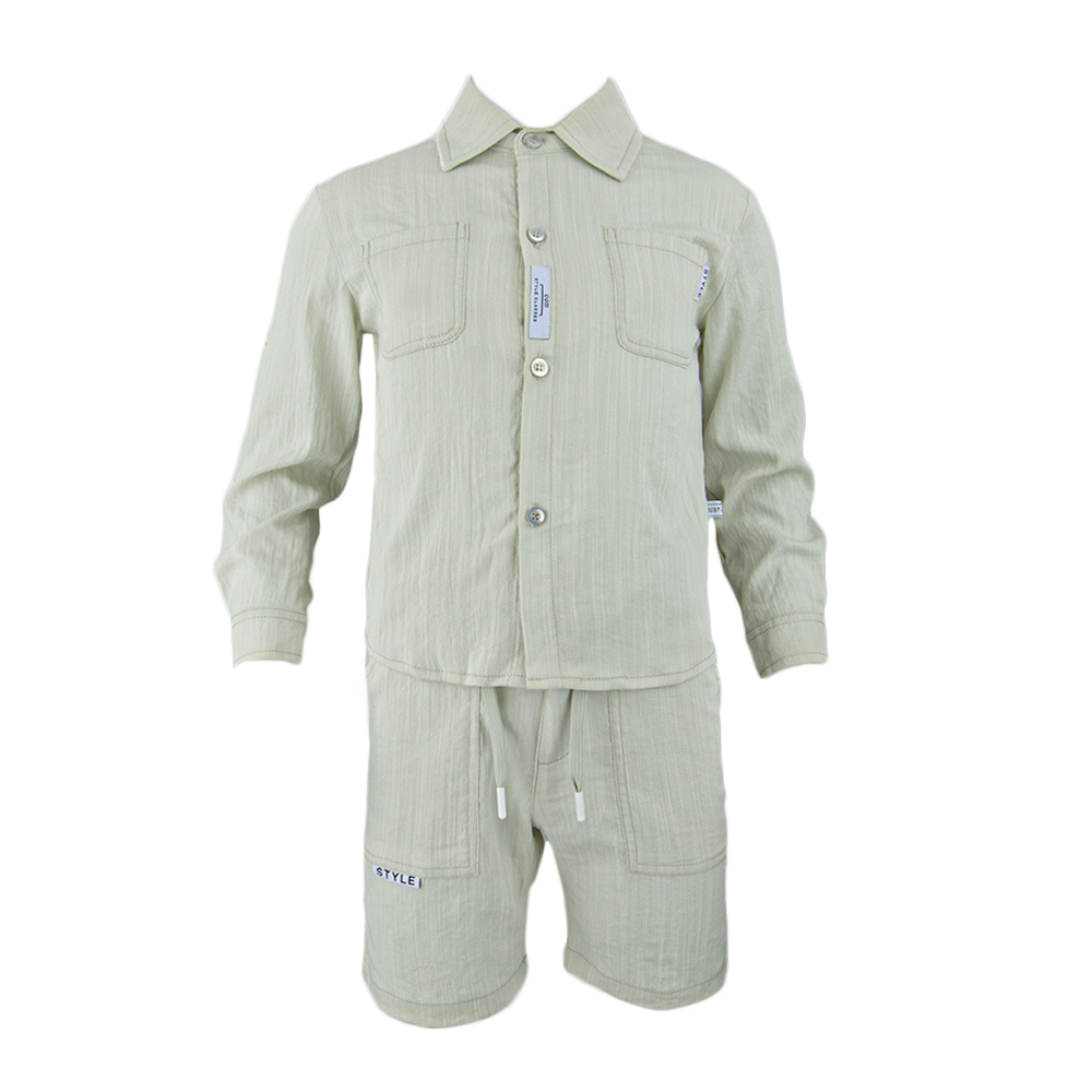 طقم ولادي كاجوال مكون من شميز بأكمام طويلة ، ازرار ، جيوب أمامية ، و بنطلون برمودا بجيوب .