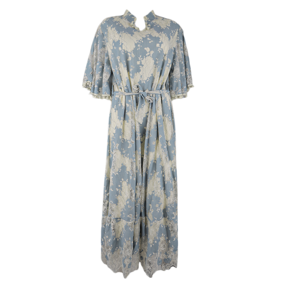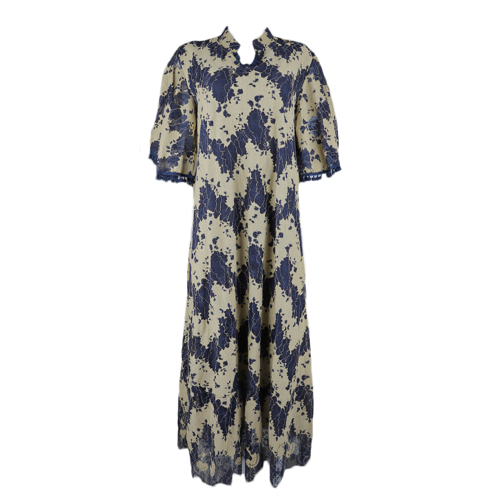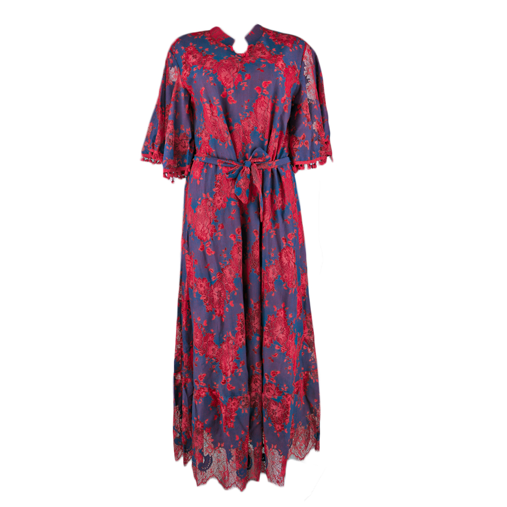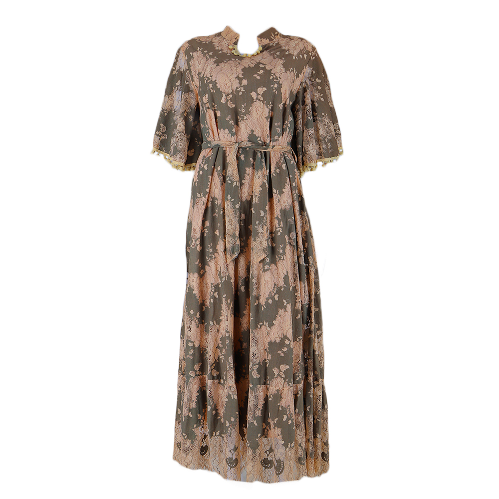 فستان نسائي بقماش منقوش بالكامل بياقة مرتفعة ، أكمام قصيرة واسعة ، و بربطة على الخصر من نفس القماش