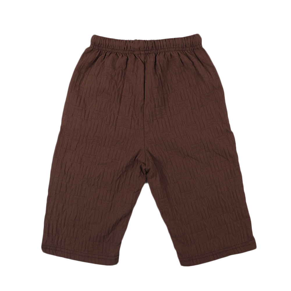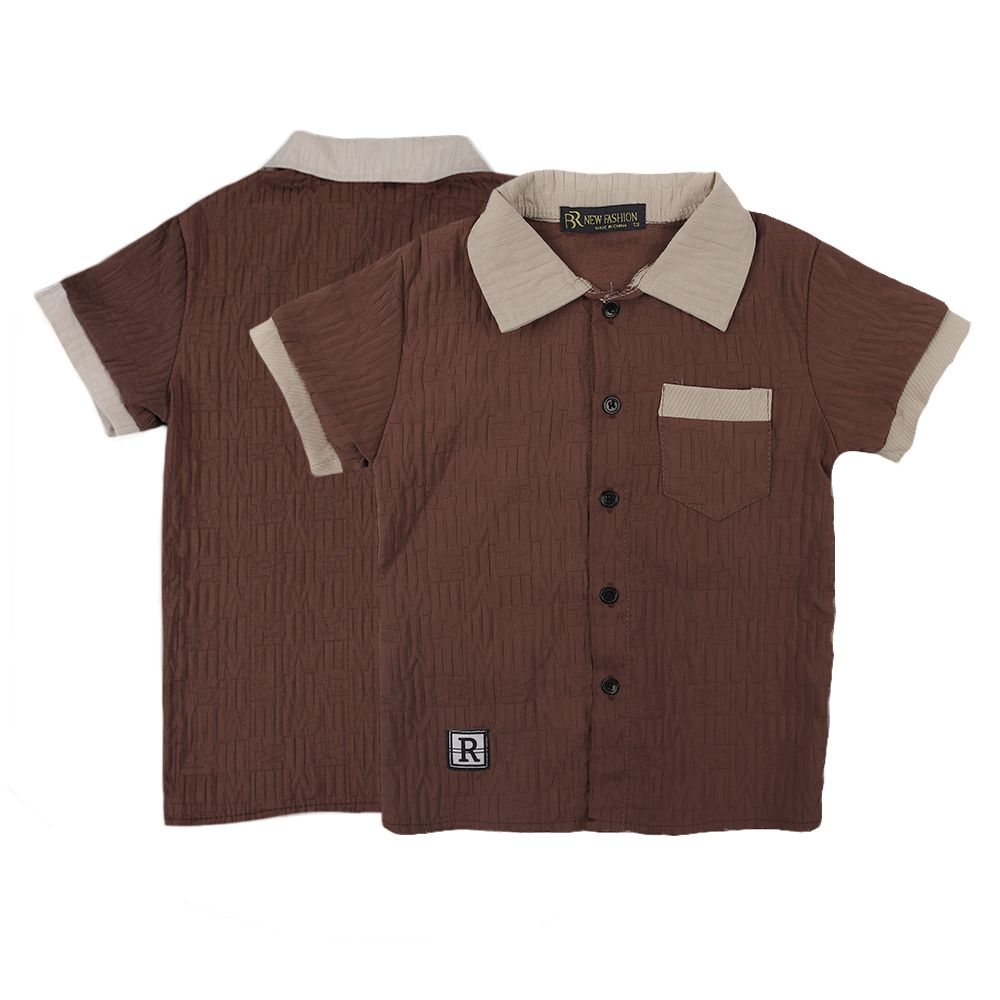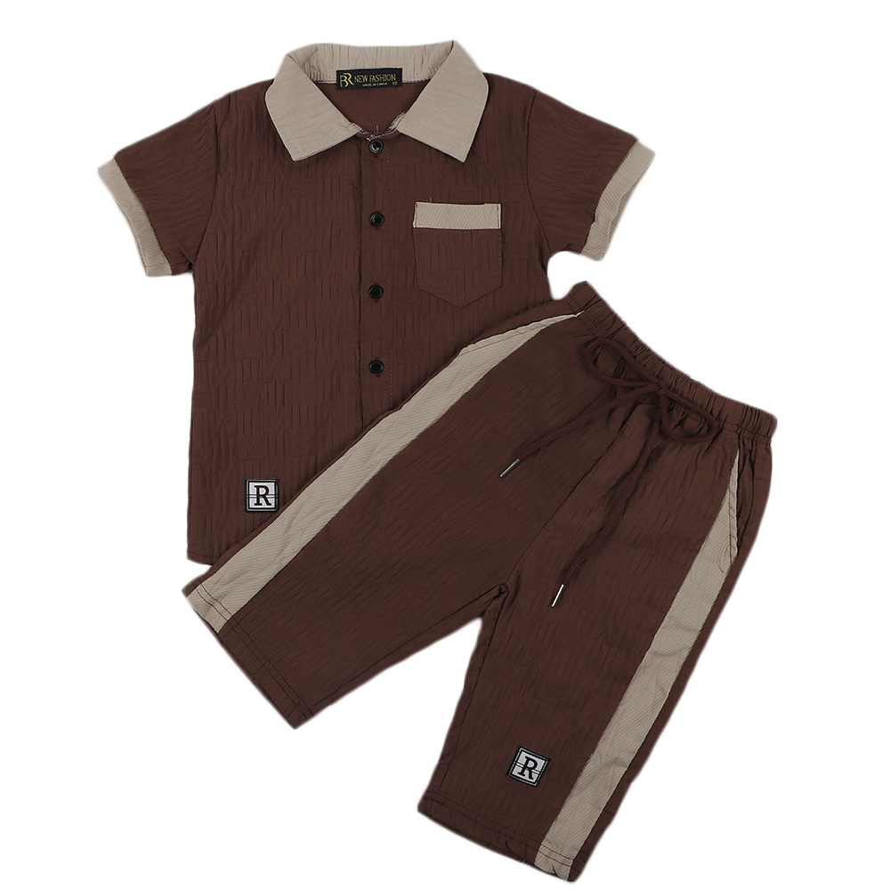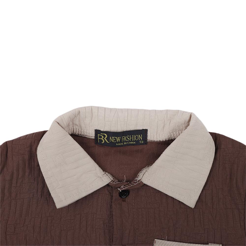 طقم ولادي أنيق يتكون من قميص بأزرار أمامية وجيب صغير على الصدر، مع شورت برباط خصر مطاطي لراحة أكبر. يتميز بتصميم عصري مناسب للارتداء اليومي والمناسبات البسيطة.