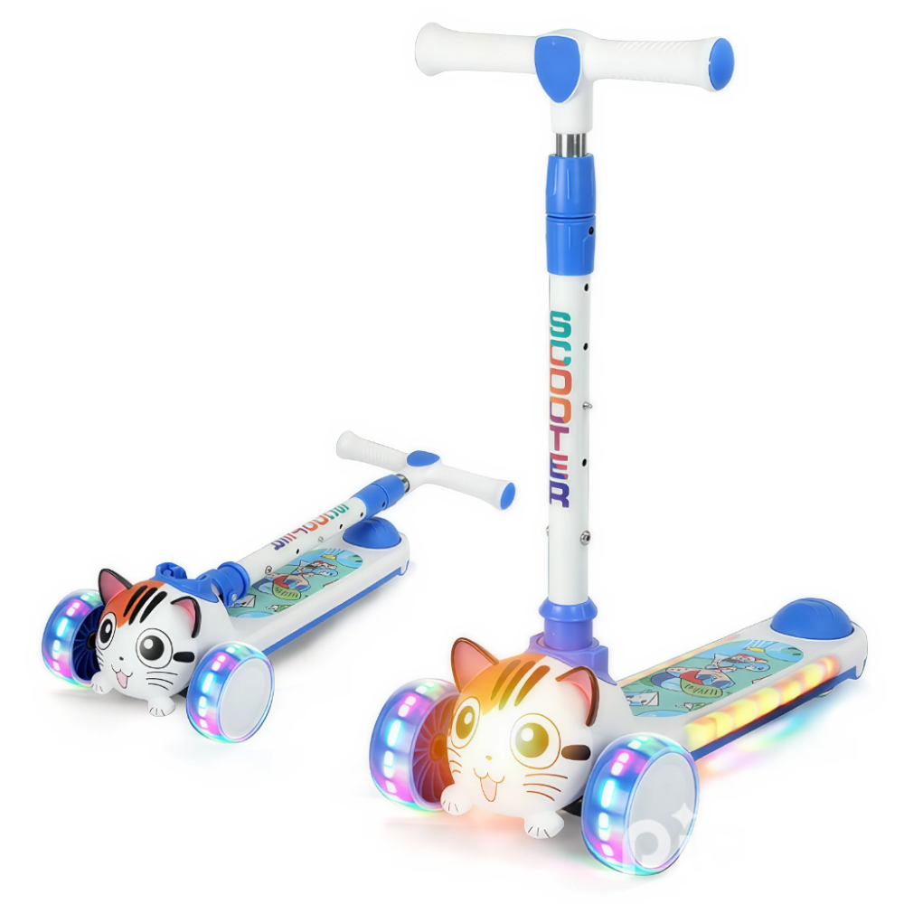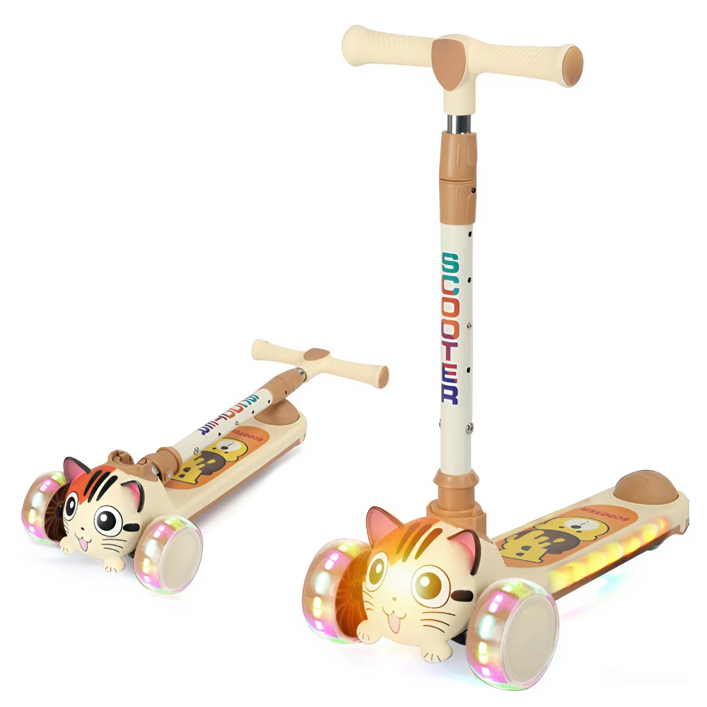اسكوتر اطفال يحتوي على عجلات مضيئة وتصدر موسيقى وتتميز بتصميمها اللطيف الذي يشبه القطة، وألوانها الوردية الزاهية، وعجلاتها المضيئة الجذابة