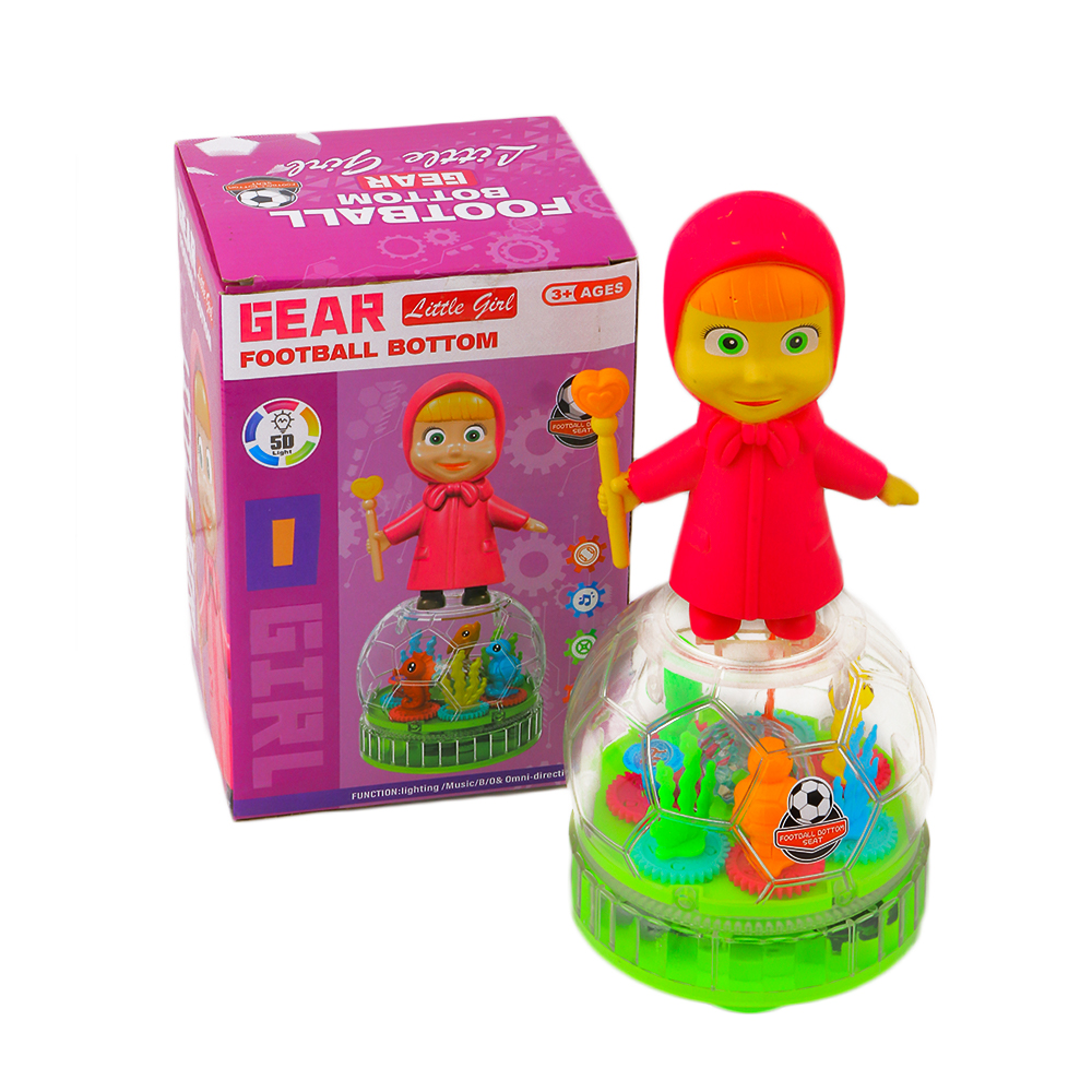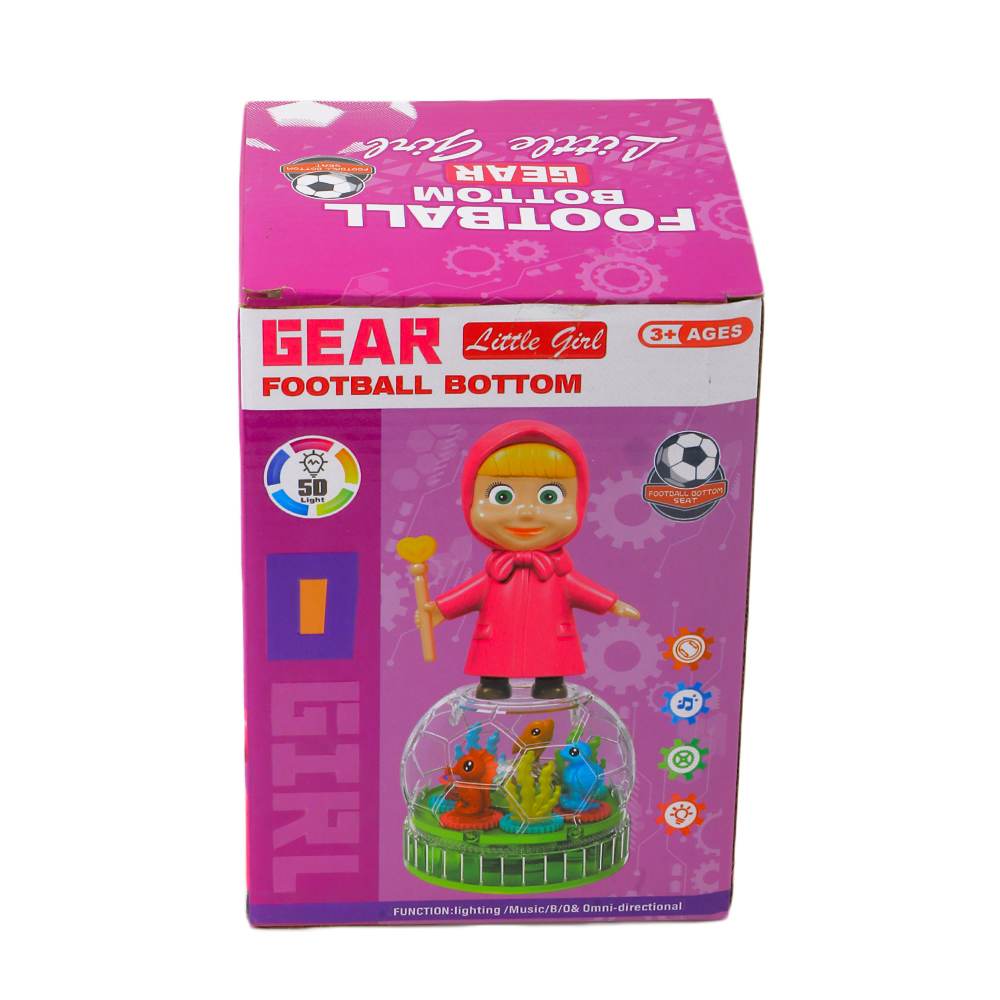 لعبة على شكل دمية صغيرة ترتدي فستانًا ورديًا مثبتة فوق قاعدة شفافة بتصميم كرة قدم تحتوي على تروس ملونة متحركة، تضيف متعة بصرية وحركة تفاعلية للأطفال. تتميز اللعبة بأضواء ومؤثرات موسيقية تزيد من جاذبيتها وتشجع الطفل على اللعب والتفاعل