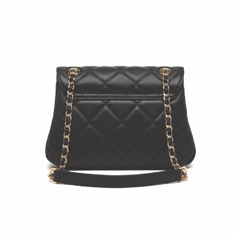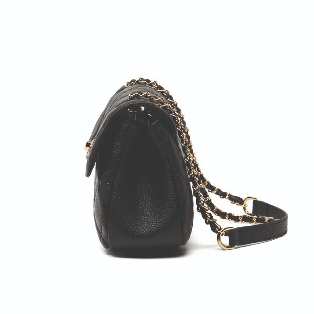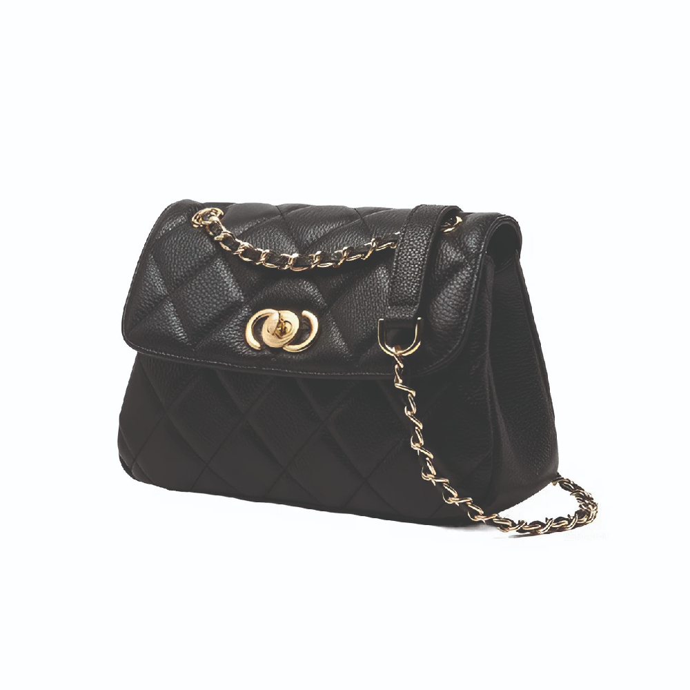 حقيبة يد نسائية أنيقة مبطنة باللون الأسود و تتميز بتصميم كلاسيكي مع تفاصيل عصرية مصنوعة من مادة ذات ملمس مبطن مما يمنحها مظهرًا فاخرًا