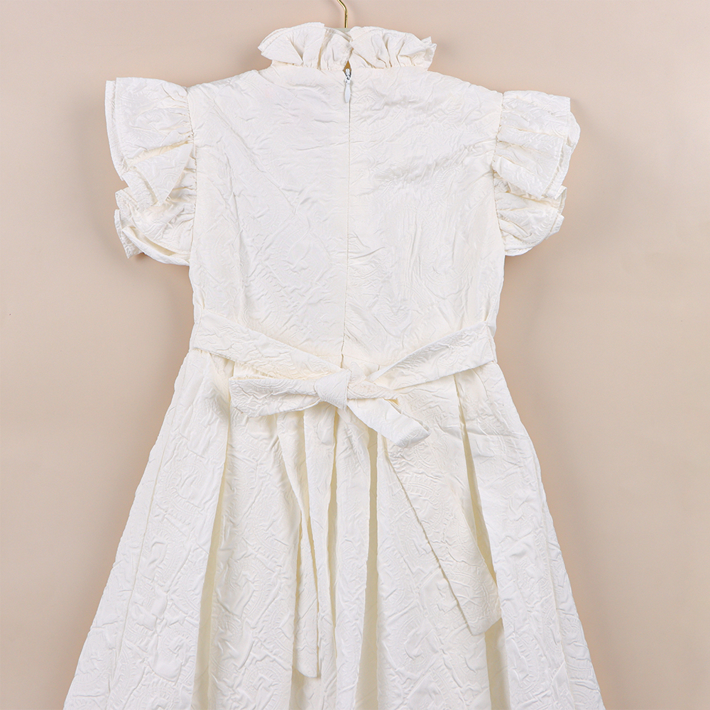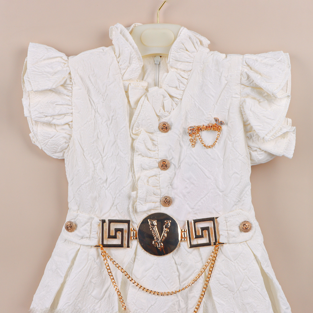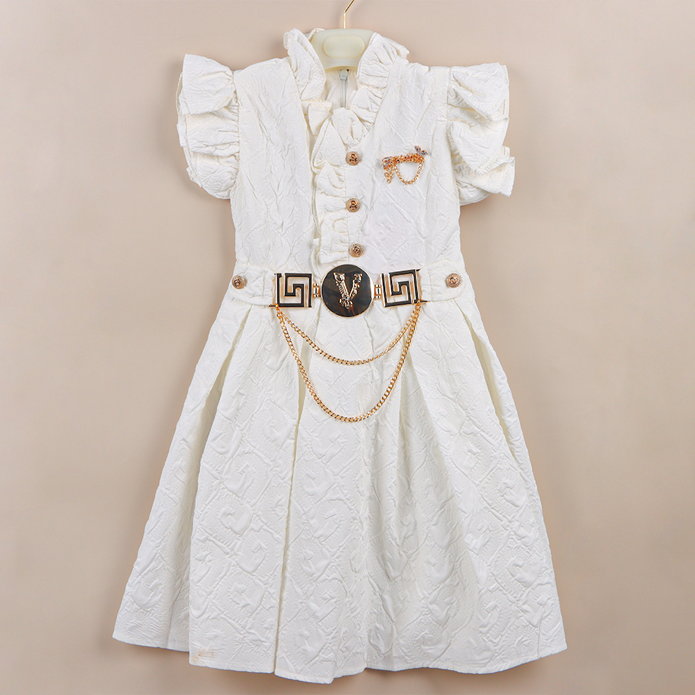 فستان بناتي أنيق باللون الأبيض بتصميم يجمع بين البساطة والفخامة يتميز بياقة مزينة بكشكش وأزرار أمامية بارزة تضفي لمسة كلاسيكية جميلة مع أكمام قصيرة منفوشة تضيف لمسة عصرية يأتي مزوداً بحزام مميز بتفاصيل باللون الذهبي وسلسلة أنيقة متدلية تمنح الفستان مظهراً فاخراً يناسب المناسبات الخاصة القماش مزخرف بنقوش بارزة ناعمة تزيد من جاذبيته وتمنحه لمسة راقية