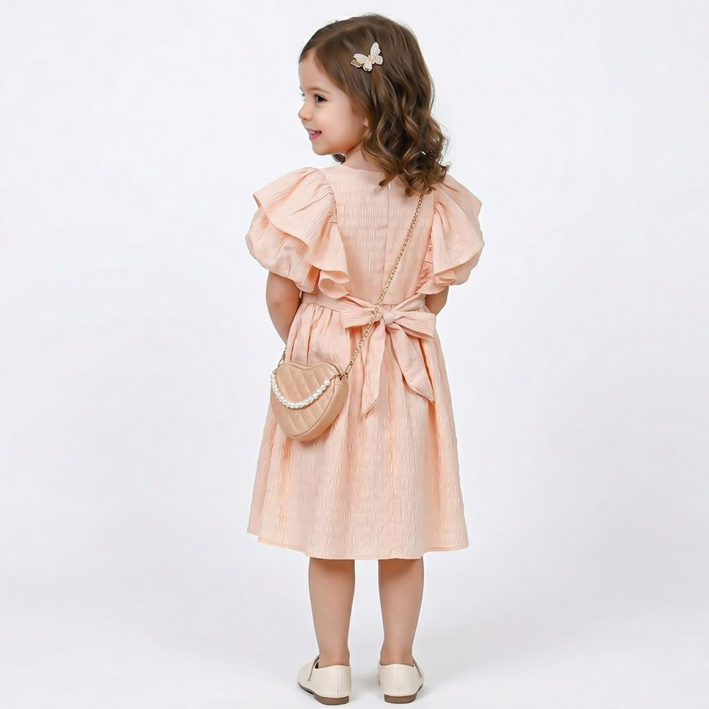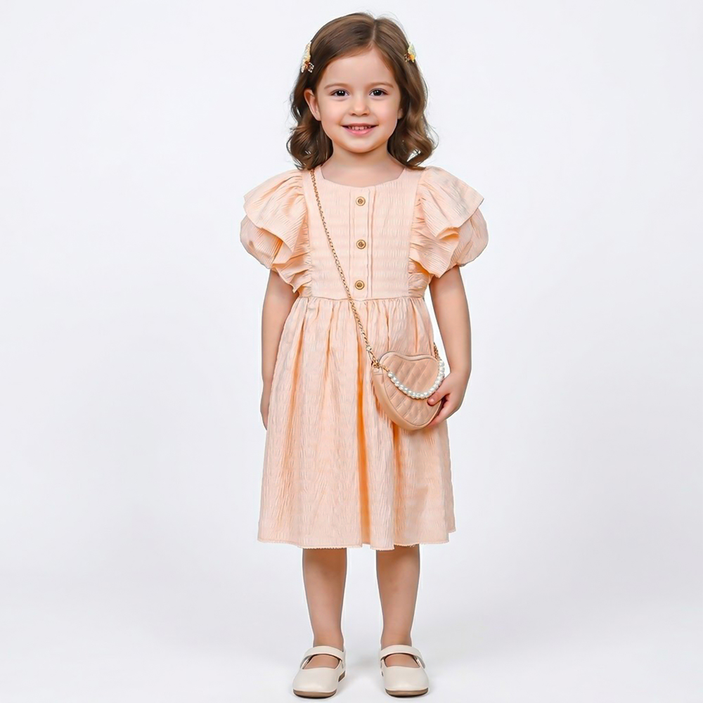 فستان بناتي ناعم يتميز بتصميم بسيط وأنيق مع أزرار أمامية بارزة تضفي لمسة كلاسيكية كما أن الأكمام الواسعة المزينة بالكشكش تمنح إطلالة عصرية مميزة تنسدل التنورة بشكل فضفاض ومريح مما يجعله مناسباً للارتداء لفترات طويلة يرافقه حقيبة صغيرة بنفس اللون بتصميم نصف دائري مع سلسلة أنيقة لتكمل إطلالة الطفلة بشكل جذاب