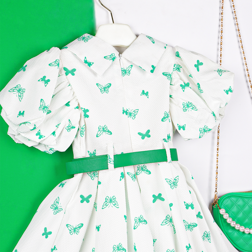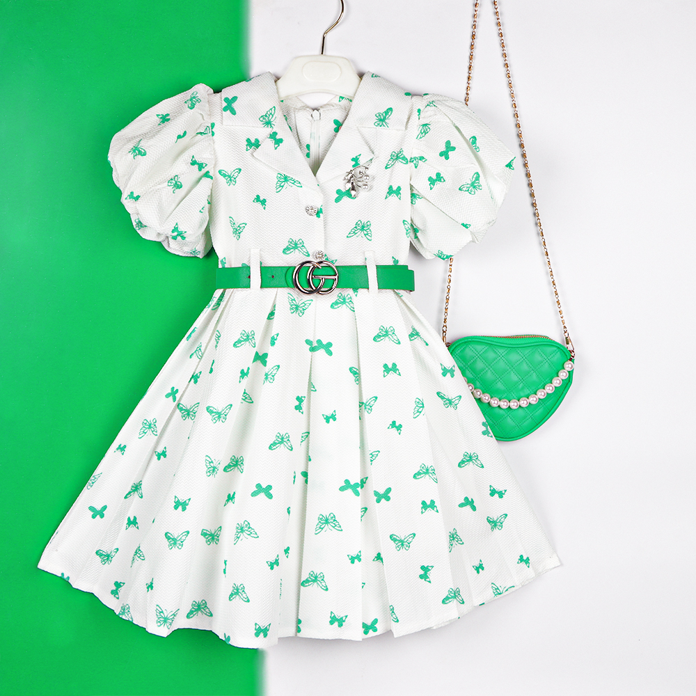فستان بناتي أنيق باللون الأبيض مزين بطبعات فراشات خضراء تمنحه مظهراً حيوياً ومبهجاً، يتميز بأكمام قصيرة منفوشة وياقة كلاسيكية تضيف لمسة راقية يزين الخصر حزام أخضر أنيق مع إبزيم معدني لامع يحدد القوام بشكل جميل ويأتي معه حقيبة صغيرة بنفس اللون مزينة بلمسة لؤلؤية في الأعلى لتكمل الإطلالة تصميمه يجمع بين البساطة والنعومة مع لمسة من الحيوية
