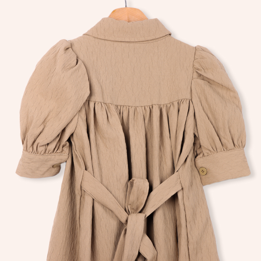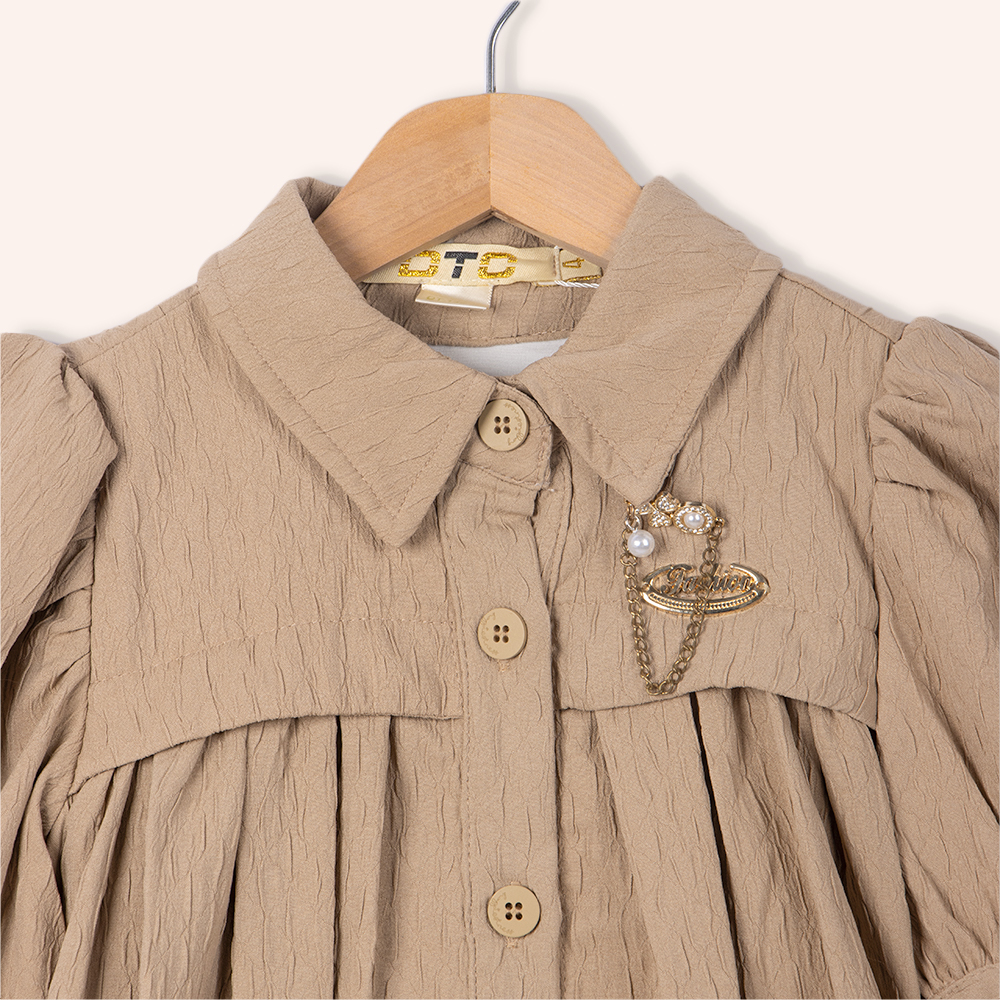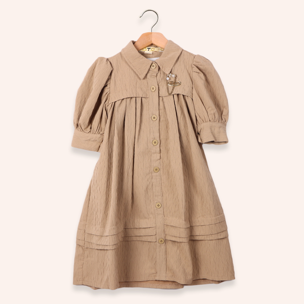 فستان بناتي أنيق بتصميم كلاسيكي مزود بأكمام منفوشة وياقة عريضة مع أزرار أمامية وزخرفة جميلة على الصدر