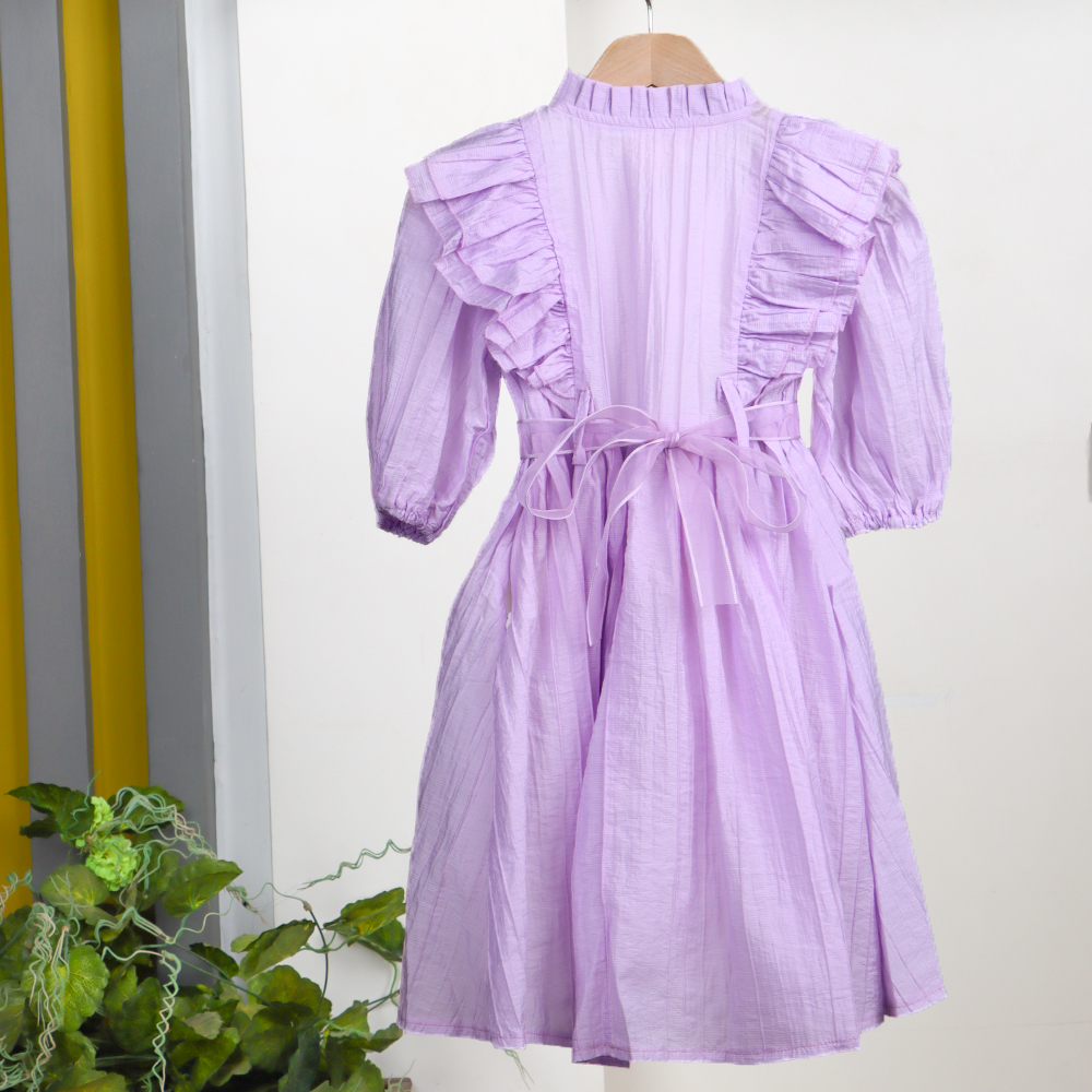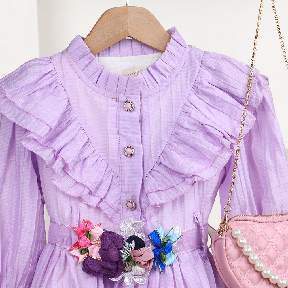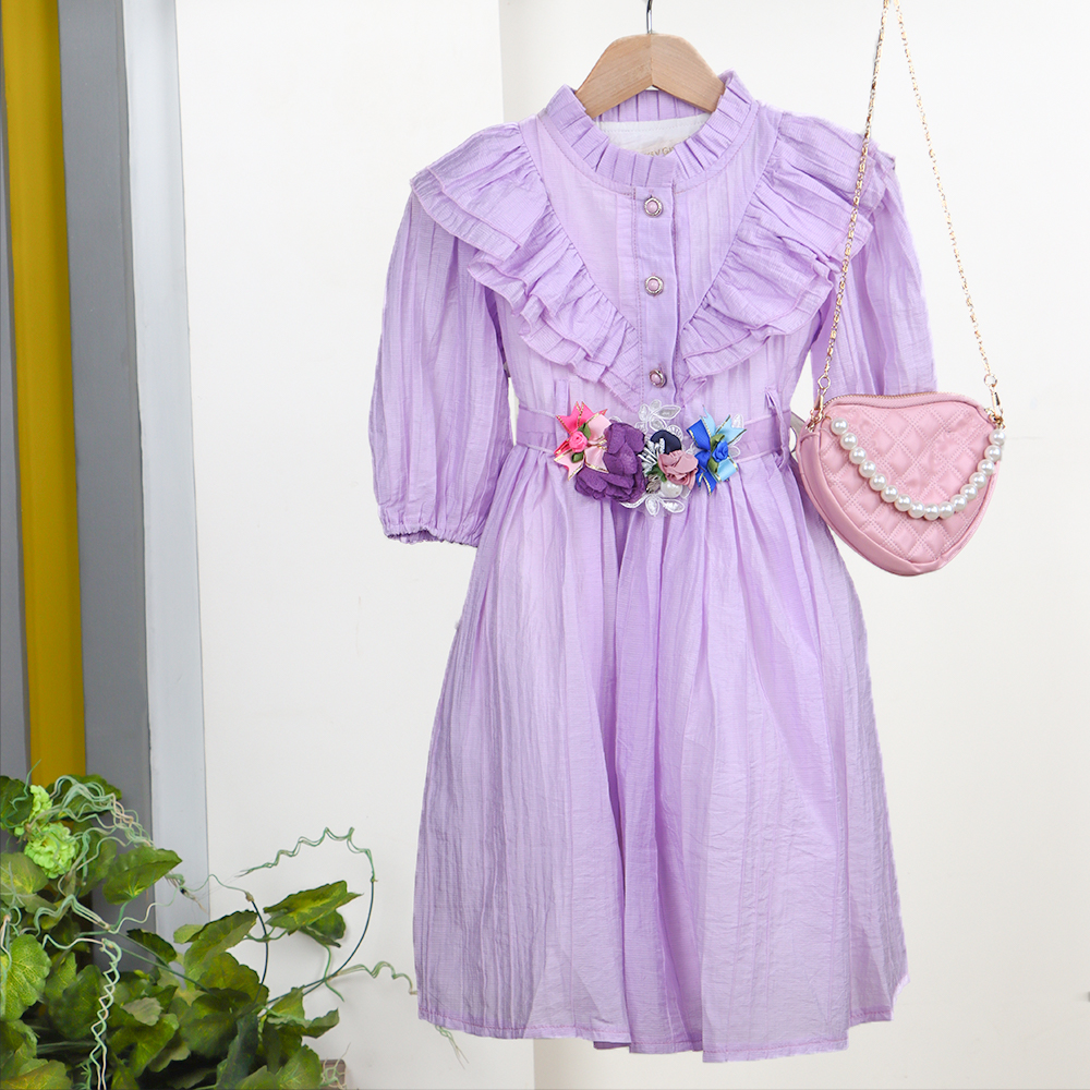 فستان بناتي بتصميم ناعم وأنيق يتميز بأكمام نصف طويلة مع أزرار أمامية وزخرفة كشكش على الصدر لإضافة لمسة أنثوية مميزة يزينه حزام مزخرف بزهور ملونة لإطلالة جذابة ويأتي معه حقيبة صغيرة وردية أنيقة بسلسلة ذهبية وخرز لؤلؤي لإكمال المظهر