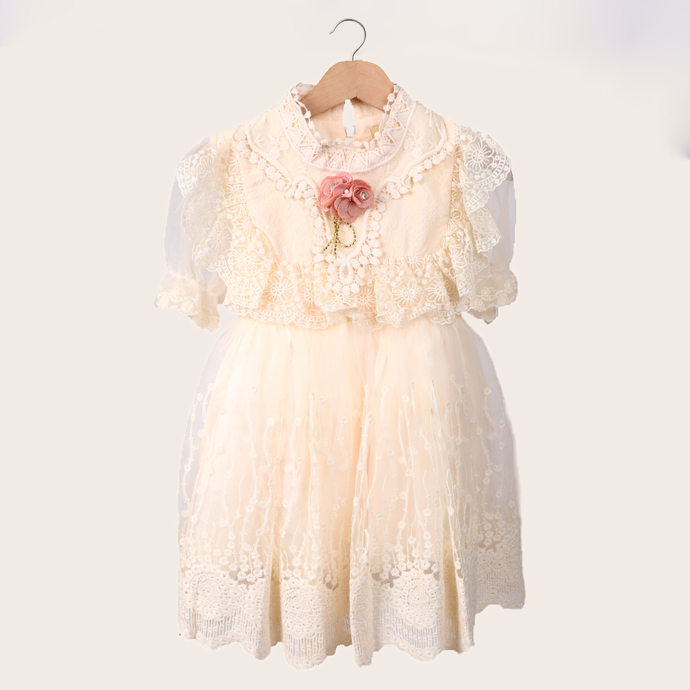 فستان بناتي أنيق مزين بالدانتيل الناعم والتطريزات الرقيقة مع وردة وردية تضيف لمسة جمالية ساحرة