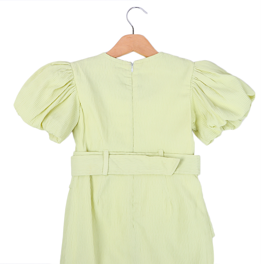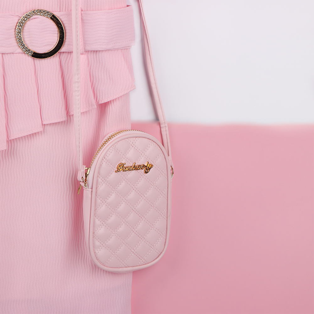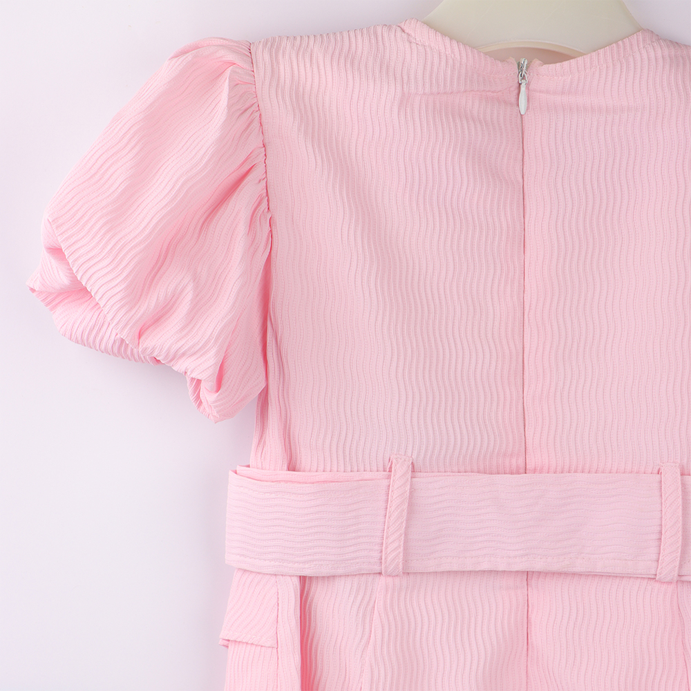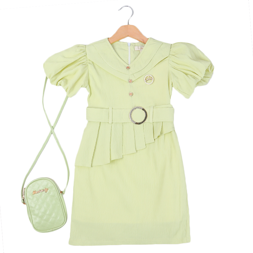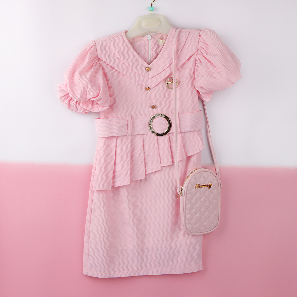 فستان بناتي بتصميم أنيق يتميز بياقة بشكل V مزينة بأزرار أمامية وأكمام منفوشة قصيرة تعطيه مظهراً طفوليًا جميلاً يزين الخصر حزام مع بكلة دائرية لامعة تضيف لمسة عصرية مع طيات أنيقة أسفل الخصر كما يأتي الفستان مع حقيبة صغيرة لتكمل الإطلالة