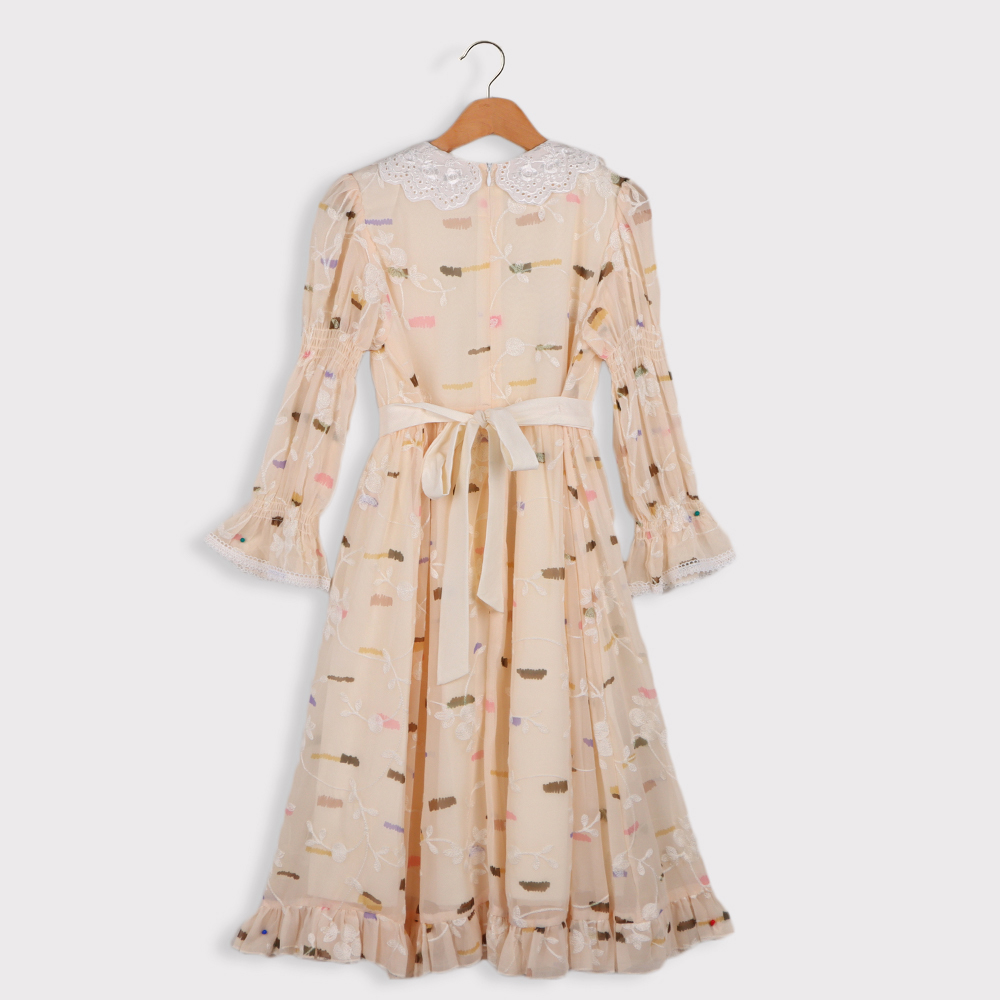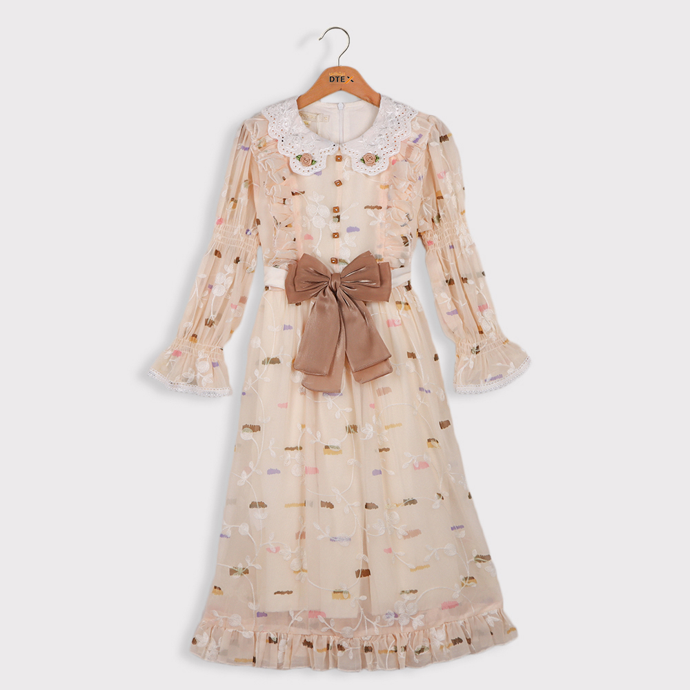 فستان بناتي بتصميم راقٍ بنقوش مطرزة بألوان هادئة تمنحه مظهراً جذاباً وأنثوياً يتميز بياقة دائرية من الدانتيل تضيف لمسة كلاسيكية أنيقة مع أكمام طويلة شفافة مزينة بتطريز ناعم وكشكش على الأطراف يزينه في المنتصف حزام ساتان مع فيونكة كبيرة تمنح الفستان لمسة فخمة تكمل أناقته
