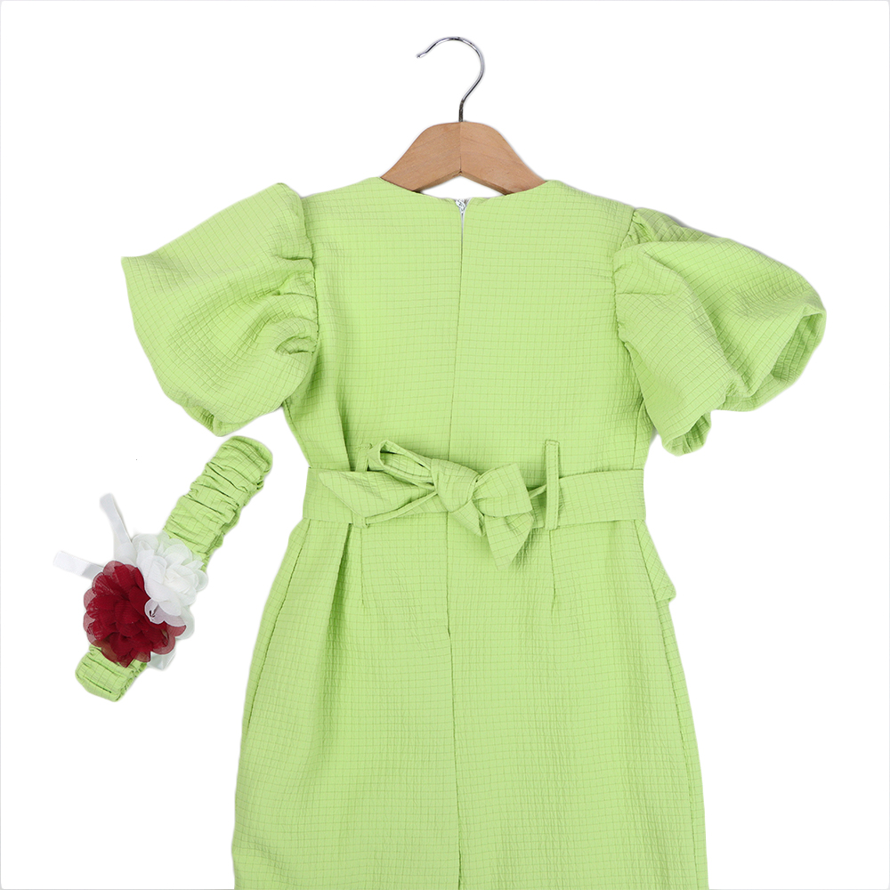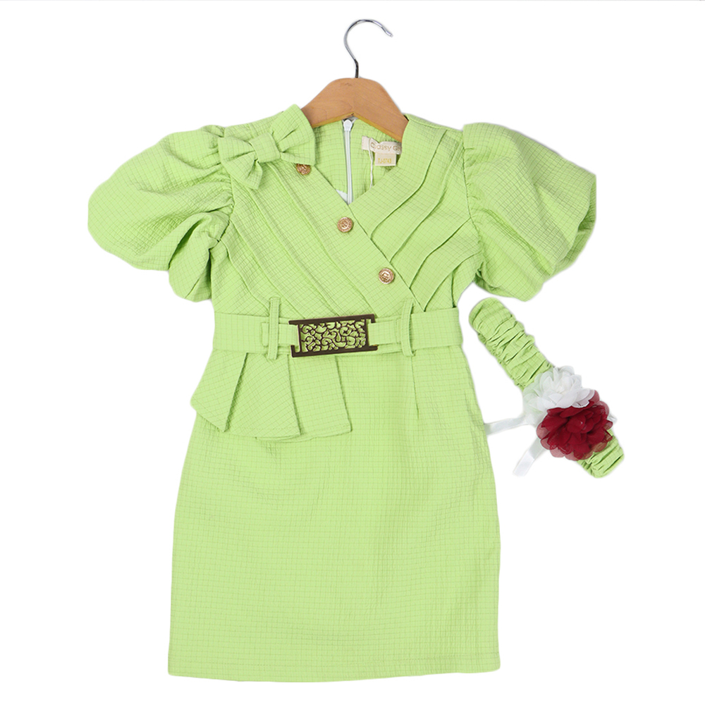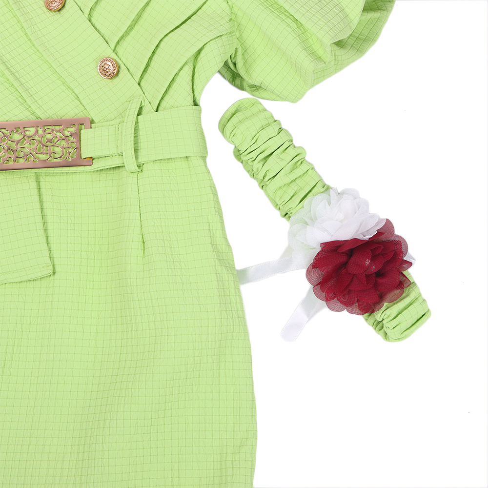 فستان بناتي بتصميم أنيق وعصري يجمع بين الفخامة والبساطة يتميز بياقة متقاطعة مع أزرار ذهبية تضيف لمسة راقية وأكمام منفوخة تمنح مظهراً أنثوياً جذاباً يأتي مع حزام بنفس اللون مزين بإبزيم معدني مزخرف لإبراز الخصر بإطلالة أنيقة بالإضافة إلى رباط بنفس اللون مزين بوردة تضيف لمسة جمالية مميزة