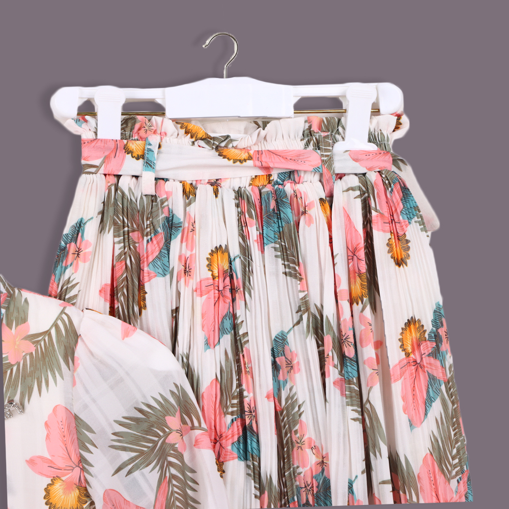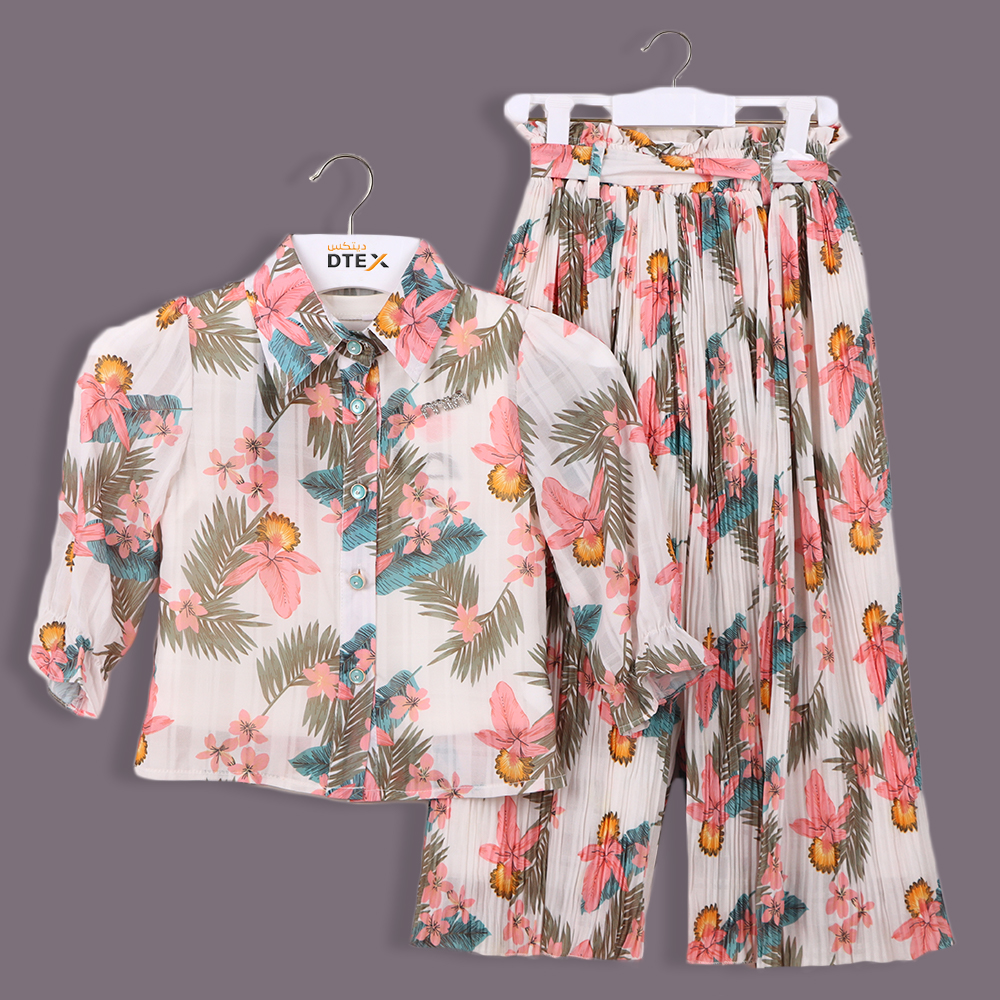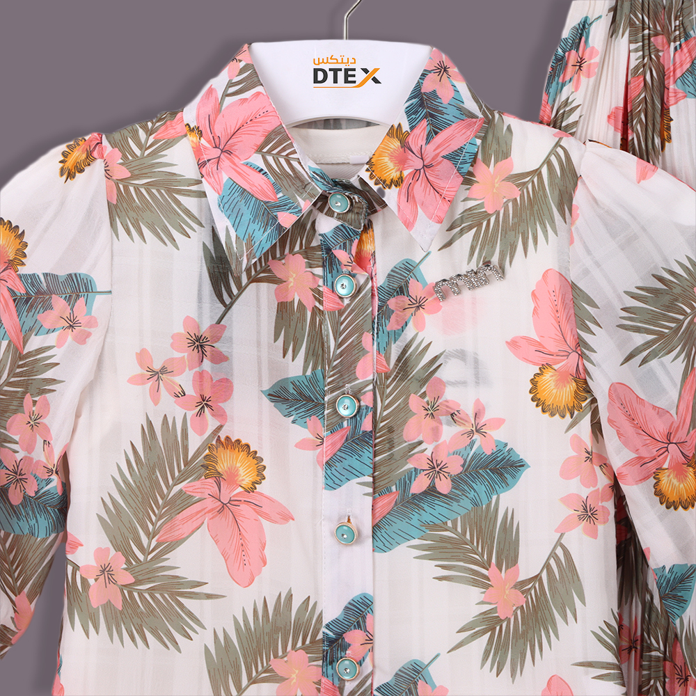 طقم بناتي أنيق بتصميم زهري عصري يجمع بين الراحة والجمال يتكون من قميص بأزرار أمامية وبنطال واسع بتفاصيل كسرات تمنح مظهراً أنثوياً ناعماً يتميز بنقشة الأزهار المتنوعة التي تضيف لمسة حيوية وجذابة لإطلالة طفلتك