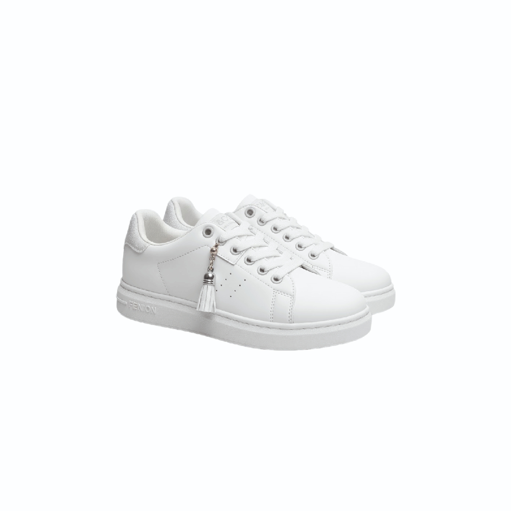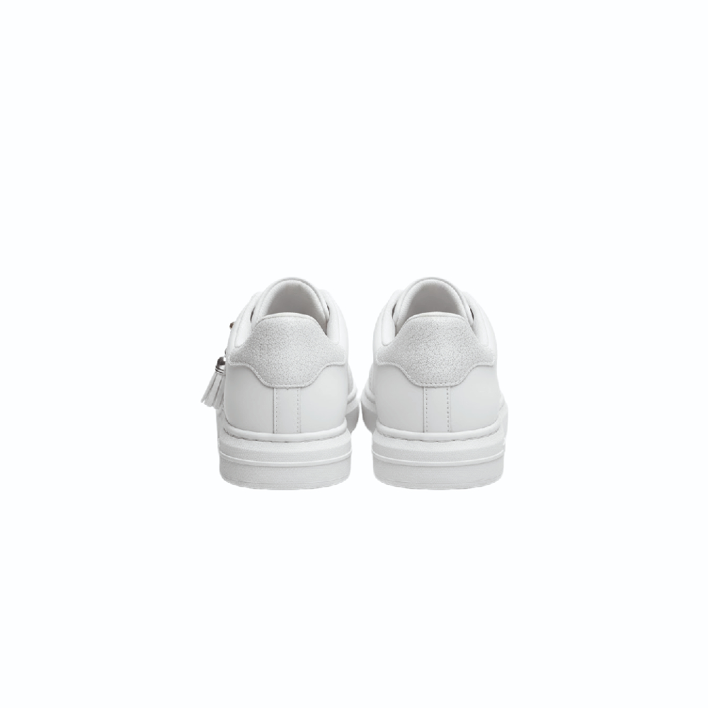 حذاء بتصميم كلاسيكي وعصري في نفس الوقت، يتميز بالخصائص التالية: اللون: أبيض بالكامل مما يجعله متعدد الاستخدامات وسهل التنسيق مع مختلف الإطلالات