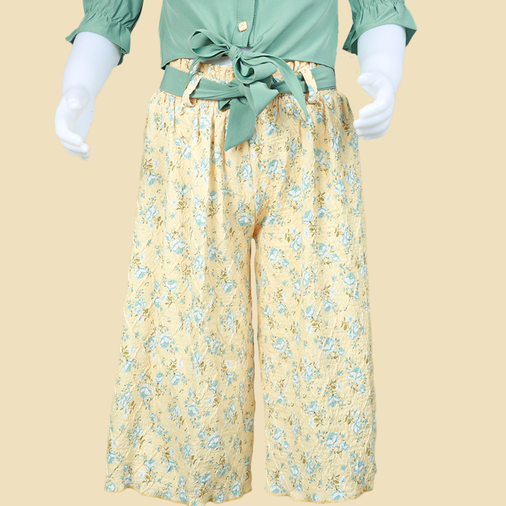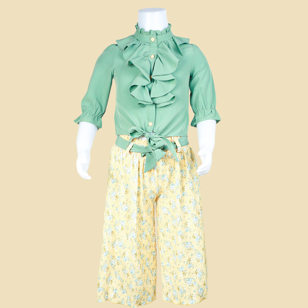 طقم بناتي أنيق يجمع بين الرقي والراحة يتكون من بلوزة ناعمة بتصميم كشكش أمامي مميز وأكمام بطول متوسط مع أزرار ذهبية تضيف لمسة فخمة البلوزة تُربط من الأمام بعقدة أنيقة يأتي معها بنطلون واسع مطبوع بنقوش زهرية ناعمة