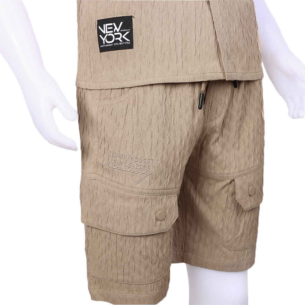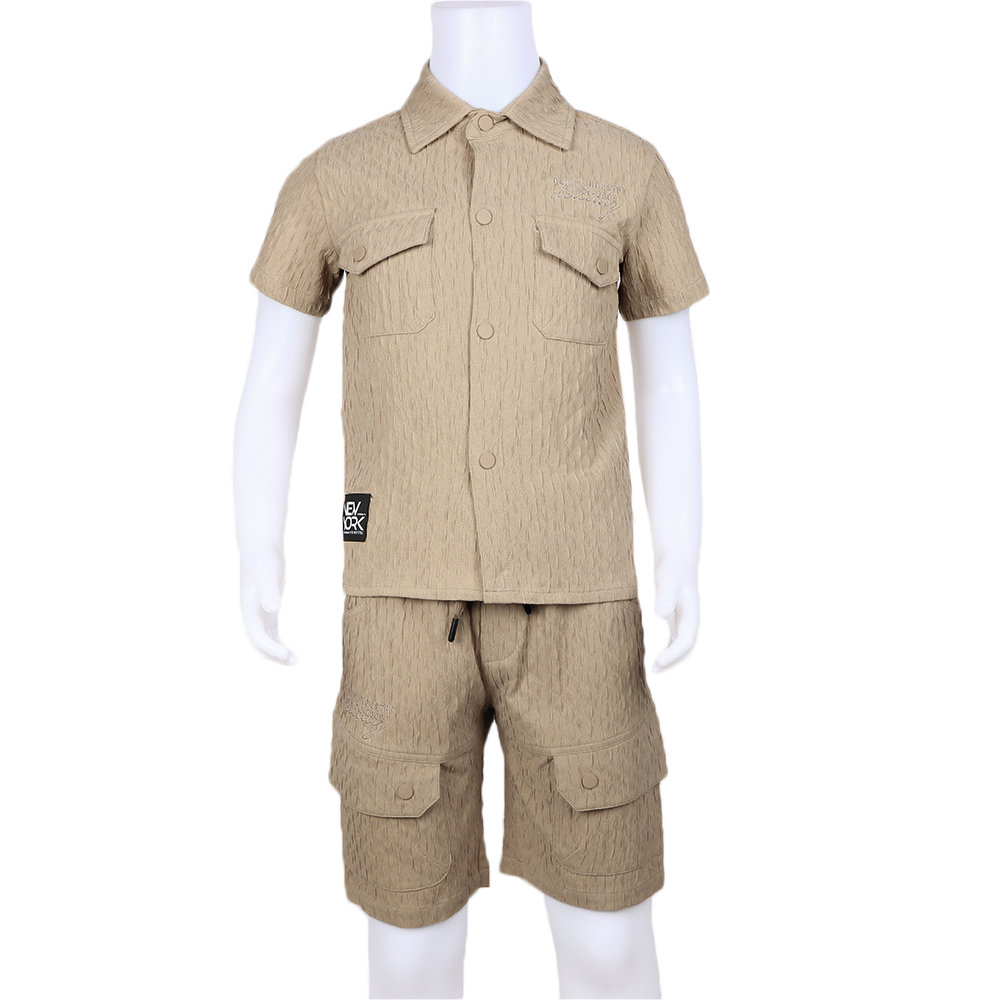 طقم ولادي أنيق بتصميم عملي وعصري مصنوع من قماش مريح وخفيف يتكون من قميص بأكمام قصيرة مع ياقة كلاسيكية وأزرار أمامية كاملة وجيوب أمامية بغطاء تضيف لمسة مميزة للتصميم يأتي معه بنطلون قصير بخصر مطاطي مزود بخيوط شد وجيوب جانبية متعددة تمنح الطقم مظهرًا شبابيًا وعصريًا