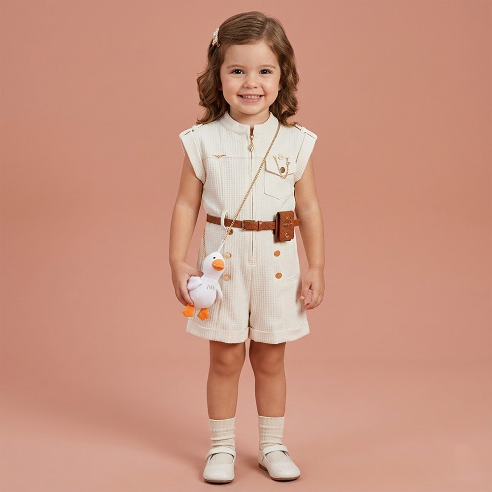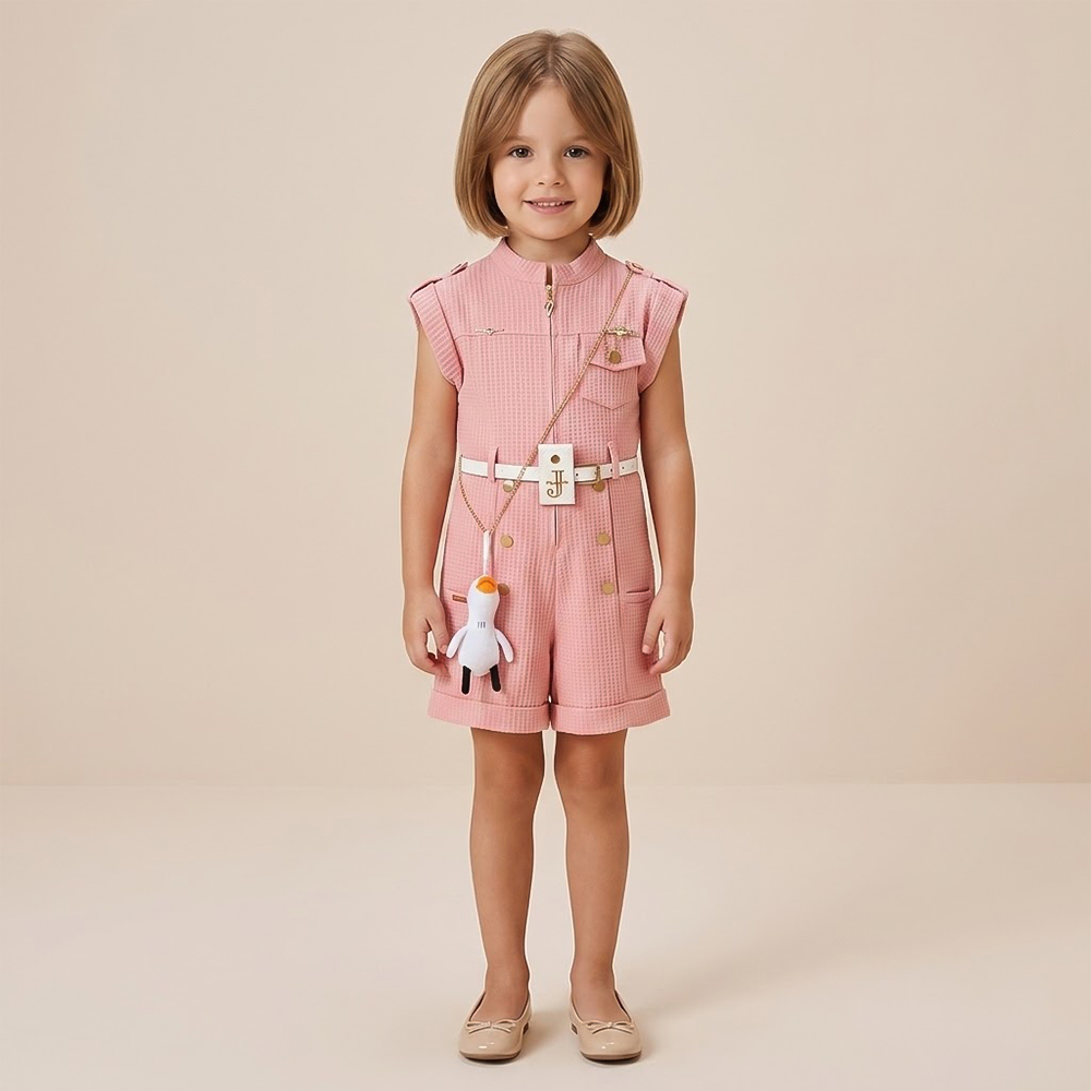 جمبسوت بناتي بتصميم عصري يتميز بأكمام بدون أكتاف وخط عنق مستدير مع سحّاب أمامي لسهولة الارتداء مزود بحزام أبيض بتفاصيل ذهبية أنيقة مع حقيبة صغيرة مرفقة على شكل بطاقة وإكسسوار محشو لطيف يضيف لمسة مرحة وجذابة تصميمه يجمع بين الأناقة والراحة ليمنح طفلتك إطلالة مميزة