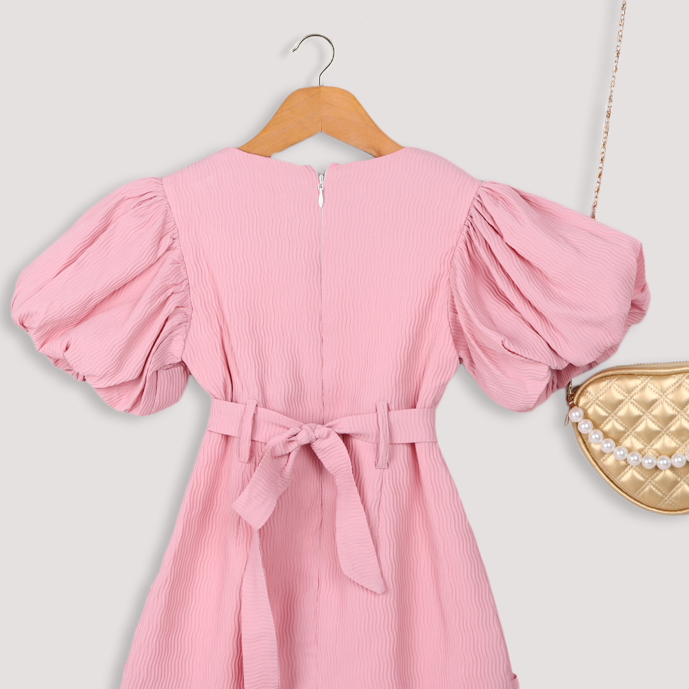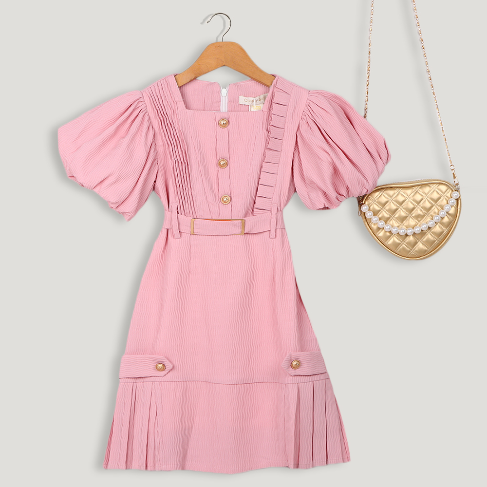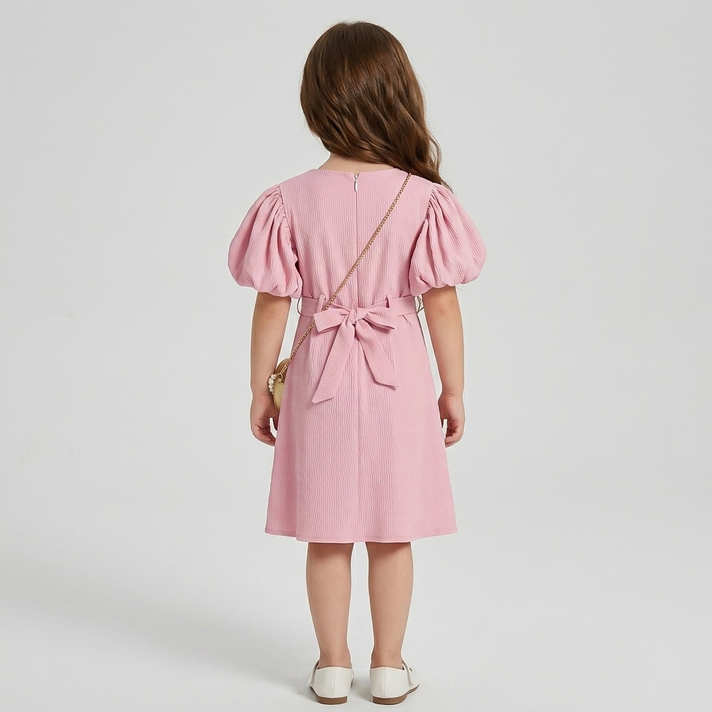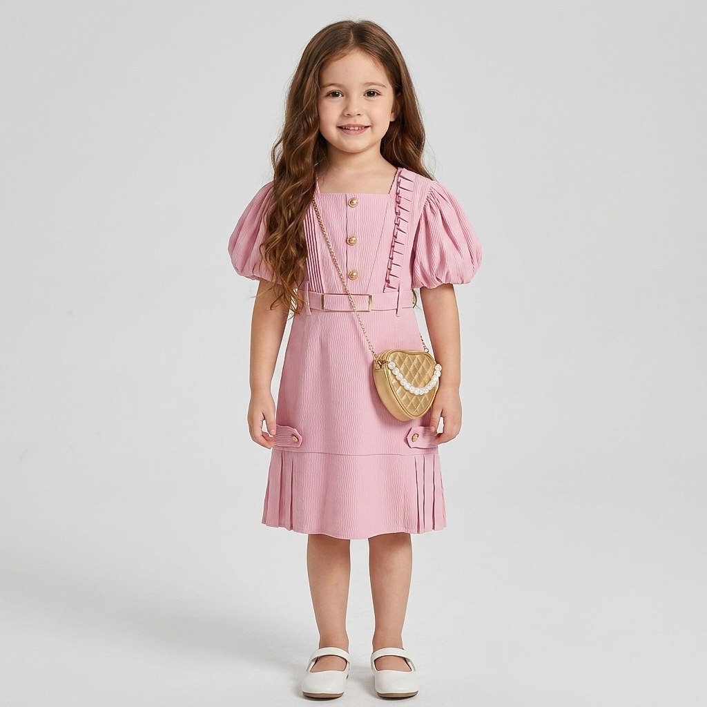 فستان بناتي ناعم بتصميم راقٍ يجمع بين البساطة والأناقة يتميز بأكمام منفوخة تضيف لمسة أنثوية مميزة وتفاصيل كشكش عمودية على الصدر تمنحه مظهراً أنيقاً مزود بحزام بنفس اللون يبرز الخصر وأزرار أمامية تضيف لمسة كلاسيكية جميلة يأتي مع حقيبة صغيرة بتصميم نصف قلب مزينة بسلسلة من اللؤلؤ لمظهر متكامل وراقي