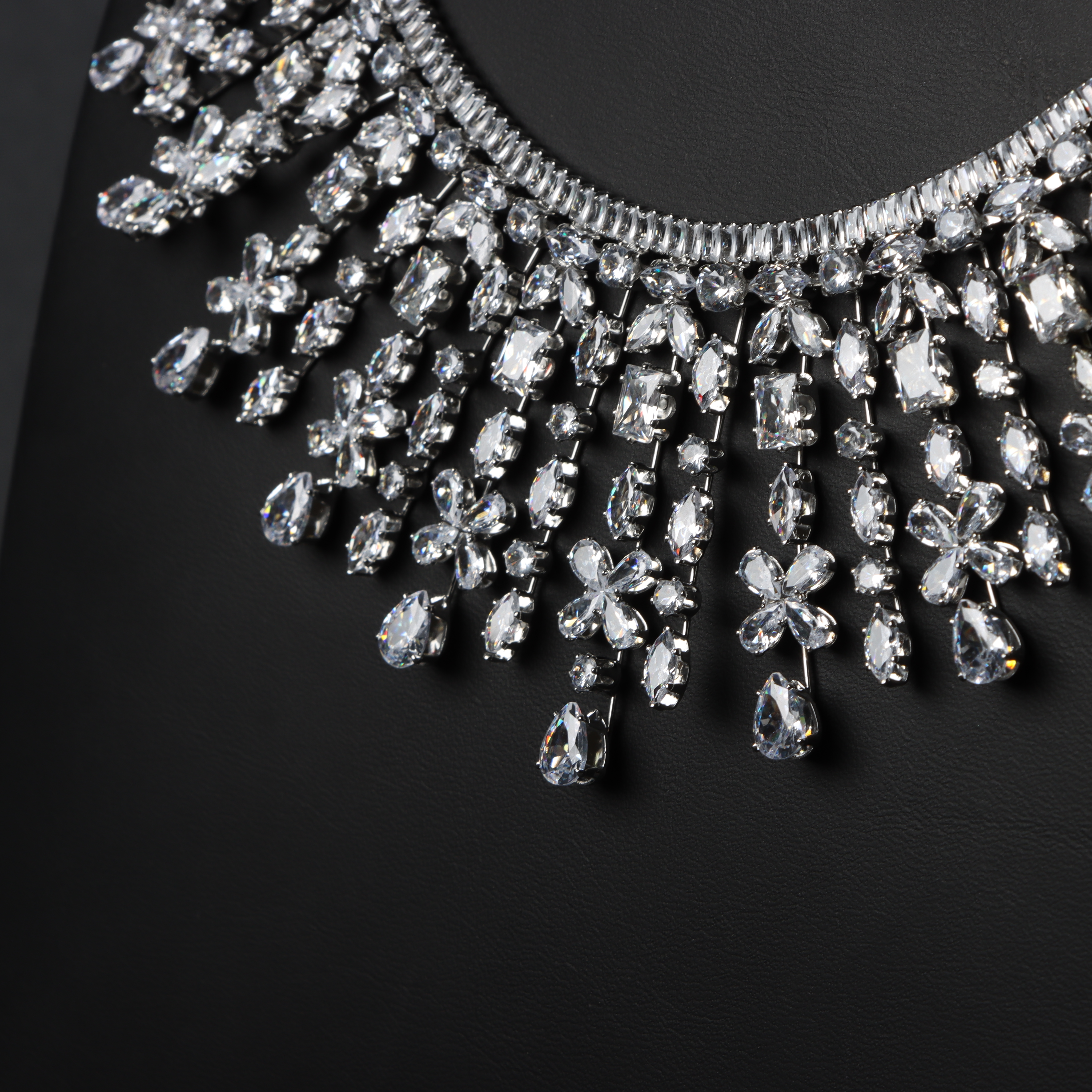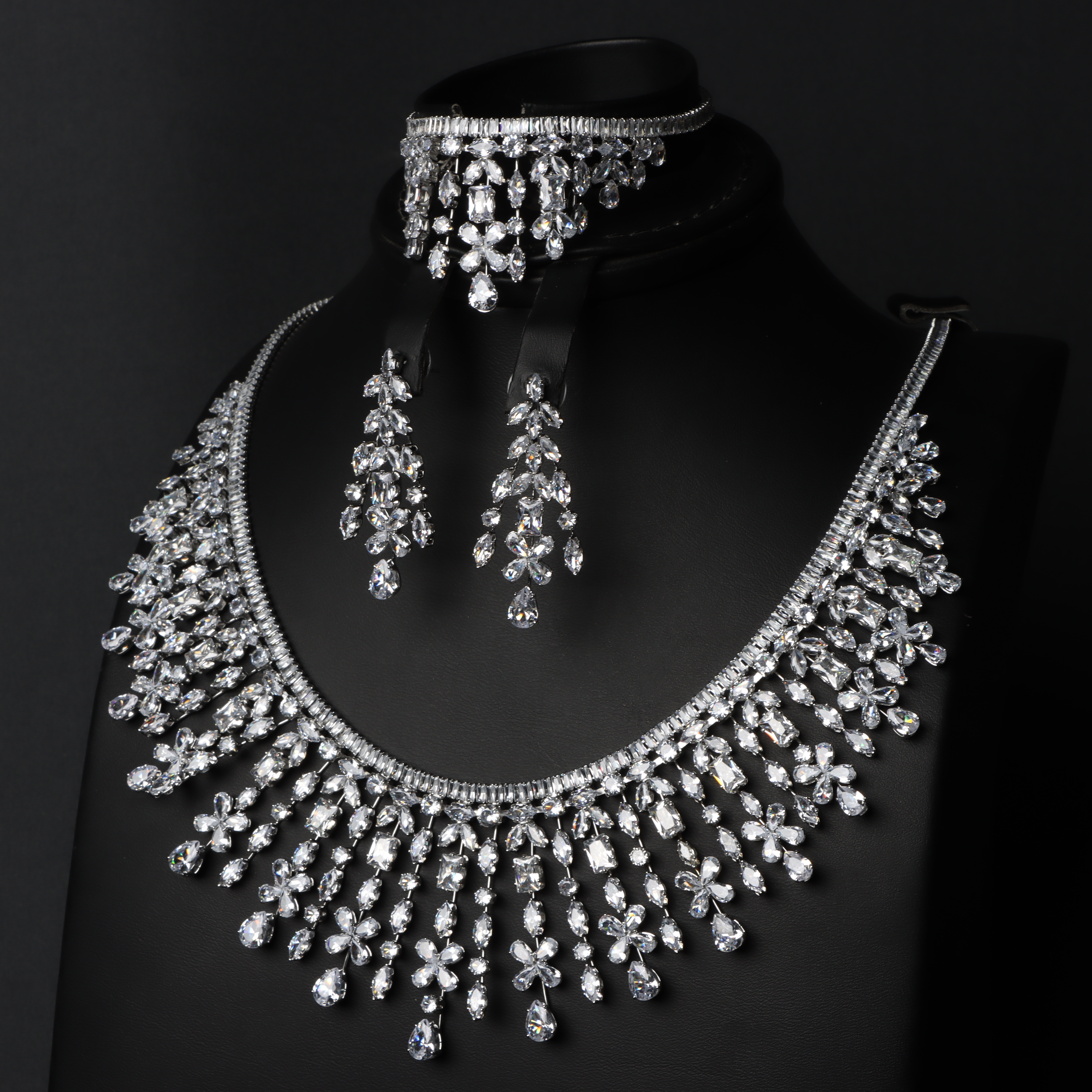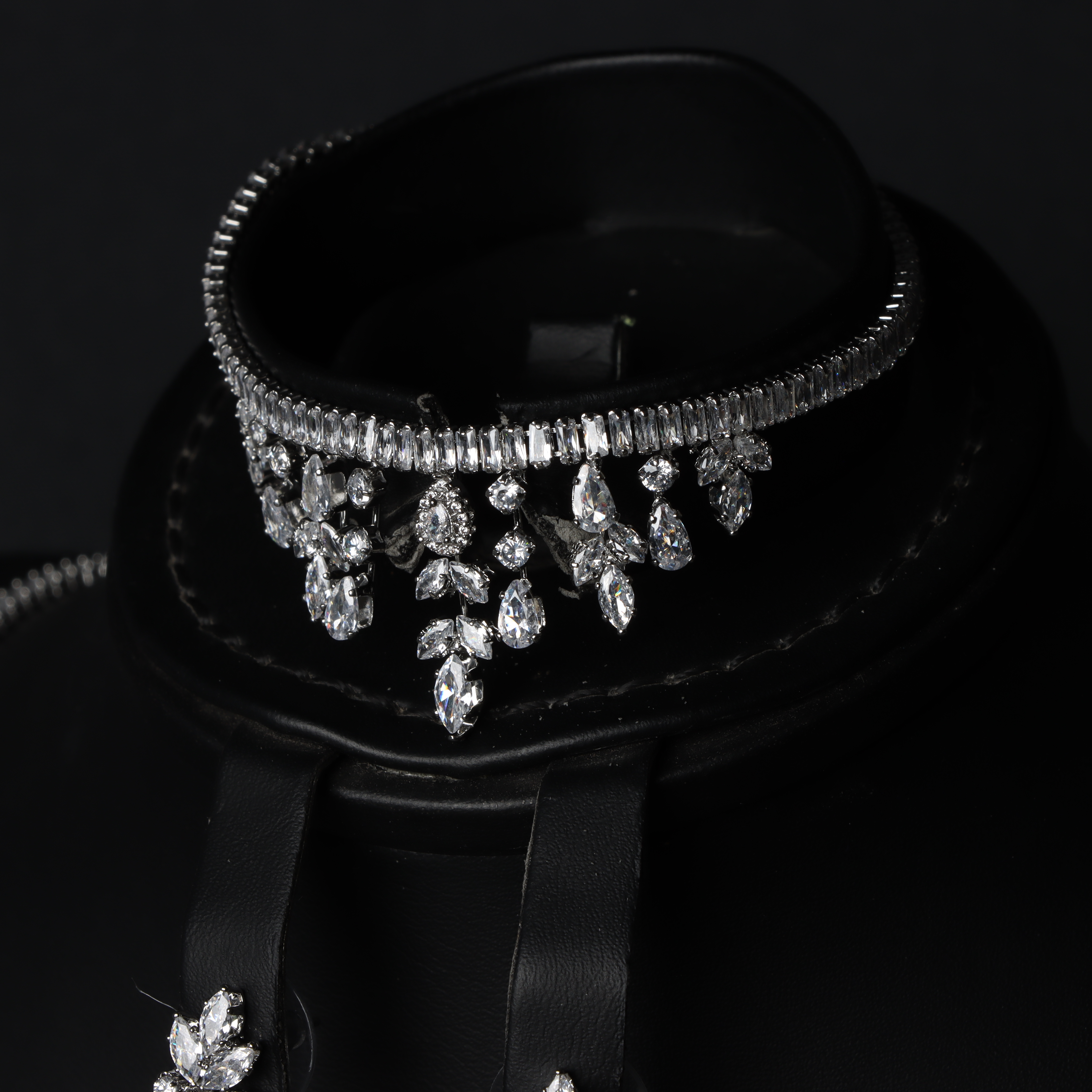 عقد واسع مرصّع بكريستالات كالشلال، مع أقراط طويلة بتصميم هندسي أنيق، وسوار ناعم بخط من الكريستالات، وخاتم فخم مزين بكريستالة لامعة يكمل الطقم بأناقة متناغمة |