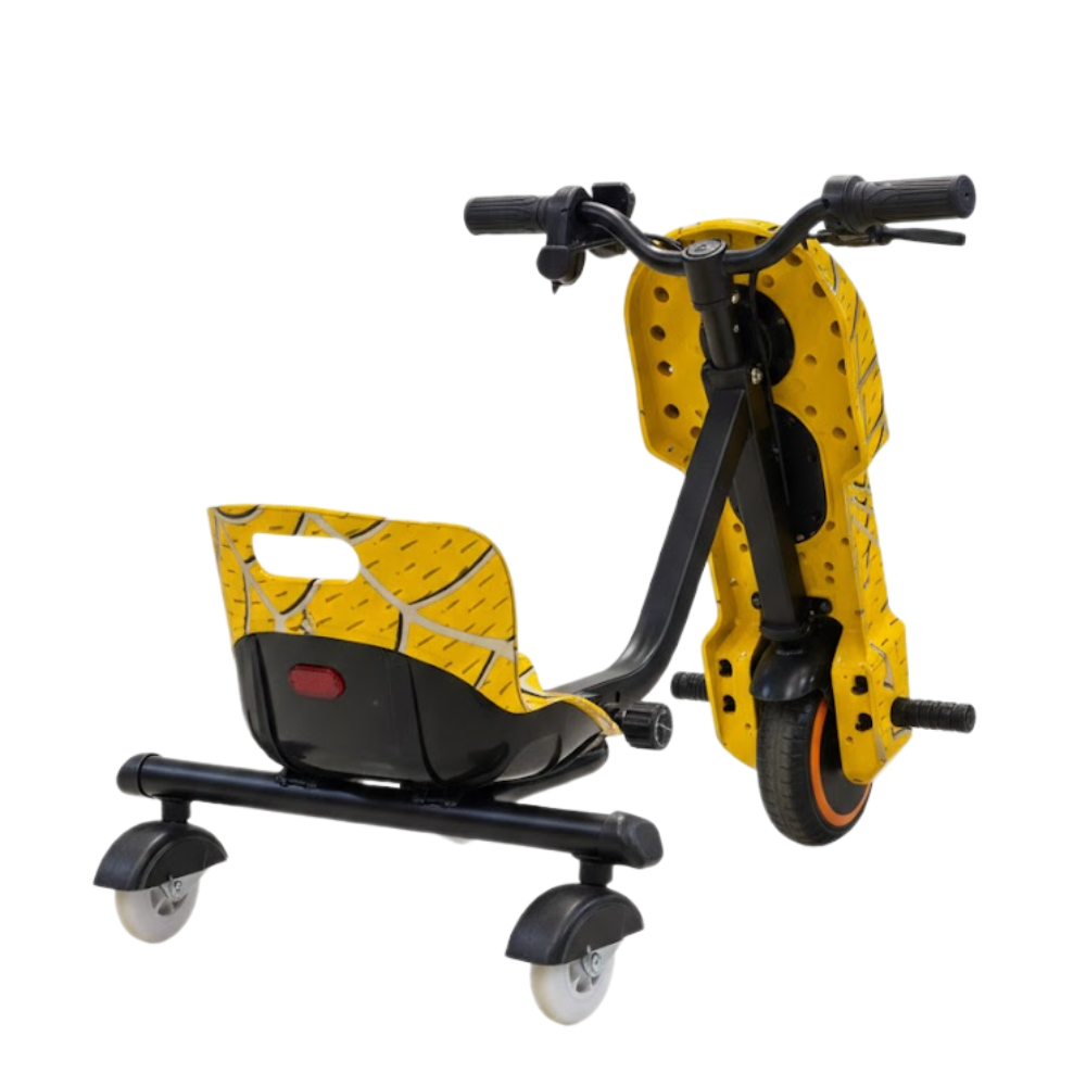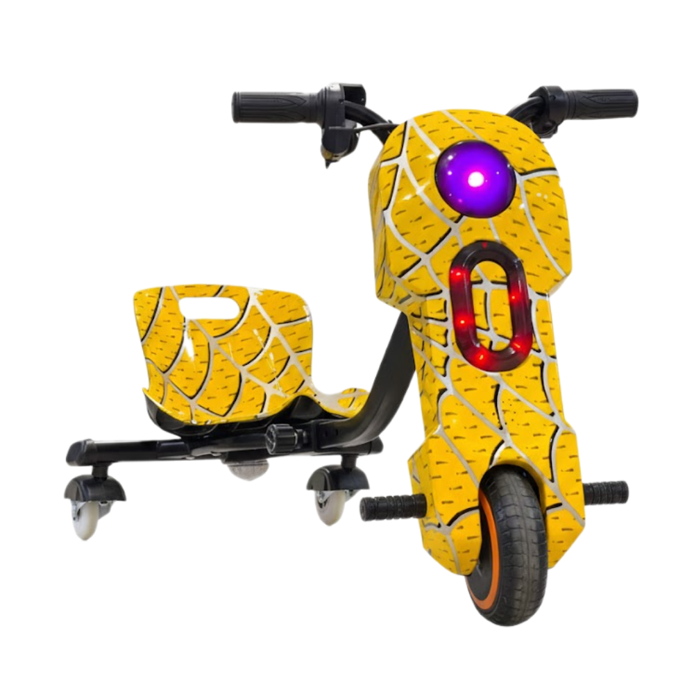الدراجة الكهربائية ثلاثية العجلات للأطفال بتحكم ثلاث سرعات ونظام تشغيل مفتاح ومزودة بـ ضوء أمامي ساطع باللون البنفسجي والمقود الامامي مزود بمقابض مطاطية لثبات اليد وتمتاز بعجلات خلفية صغيرة ومزدوجة ومصممة خصيصًا للانزلاق والدوران مما يوفر تجربة قيادة مبهجة ومليئة بالإثارة وتمتاز بتصميم جريء ومُلفت وهيكل باللون الأصفر الفاقع مع رسومات شبكة عنكبوت بيضاء وسوداء مما يمنحه مظهرًا فريدًا وحيويًا مستوحى من أبطال الخوارق والسكوتر اختيار ممتاز للباحثين عن المتعة، الإثارة، والتميز