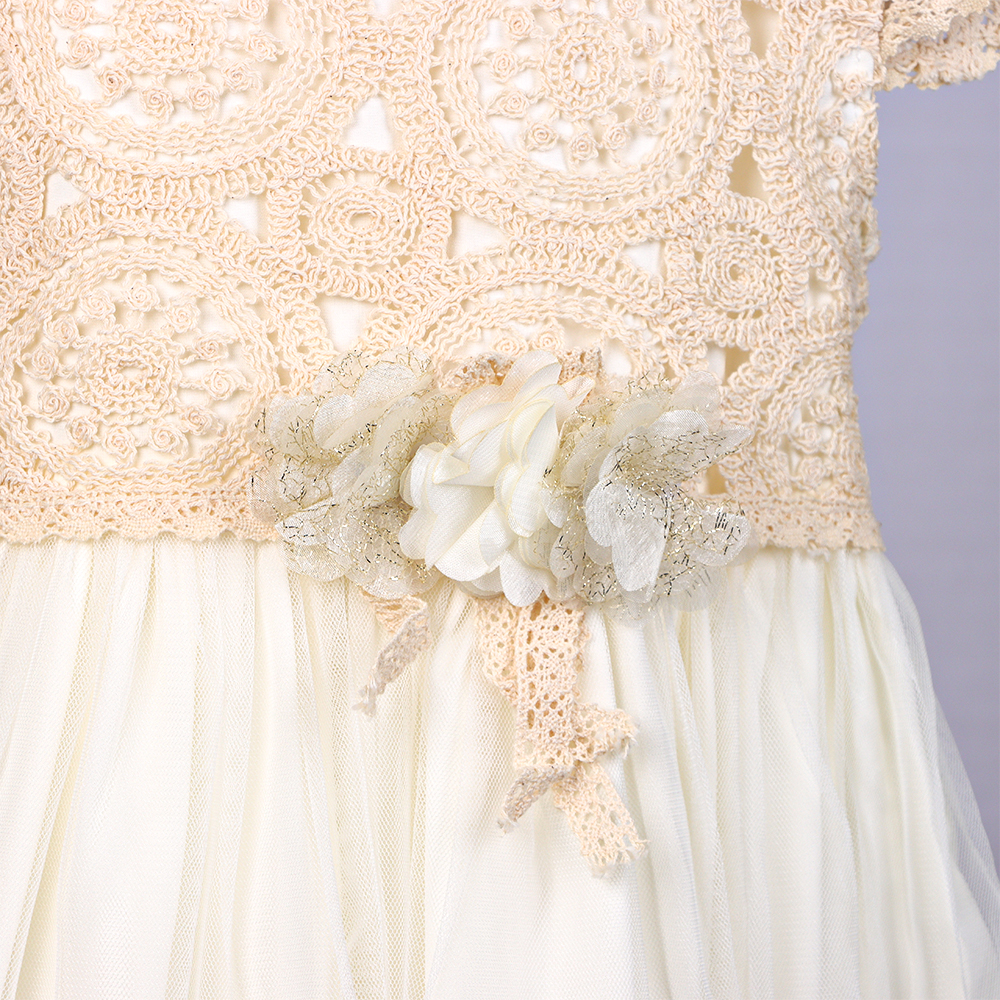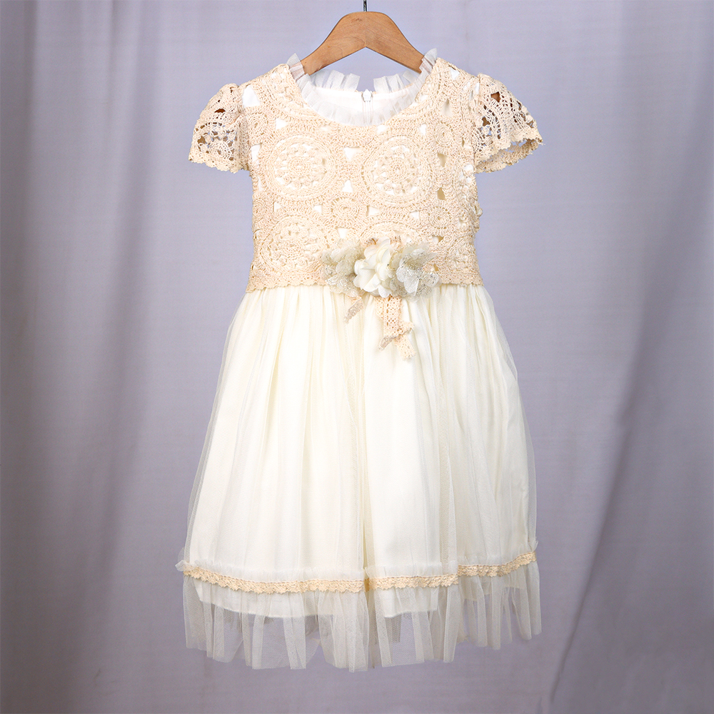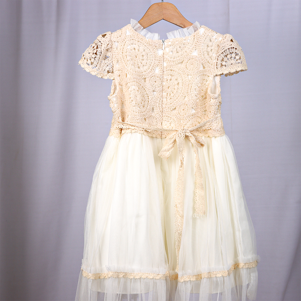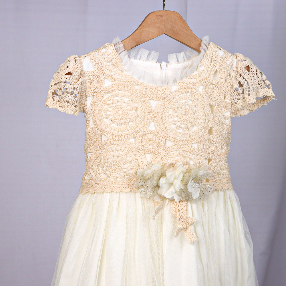 فستان أطفال أنيق بتصميم راقٍ يجمع بين النعومة والفخامة، يتميز بجزء علوي من الدانتيل المزخرف وتنورة تول شفافة بطبقات خفيفة تمنح مظهرًا حالِمًا. مزوّد بتفصيلة زهور ناعمة عند الخصر تضيف لمسة أنثوية جذابة