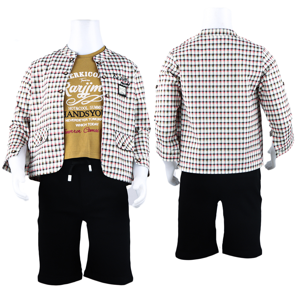 طقم أطفال عصري مكوّن من قميص كاروهات خفيف مع تيشيرت داخلي مطبوع وشورت مريح، يمنح إطلالة مرتبة وعملية تناسب الاستخدام اليومي والخروجات.