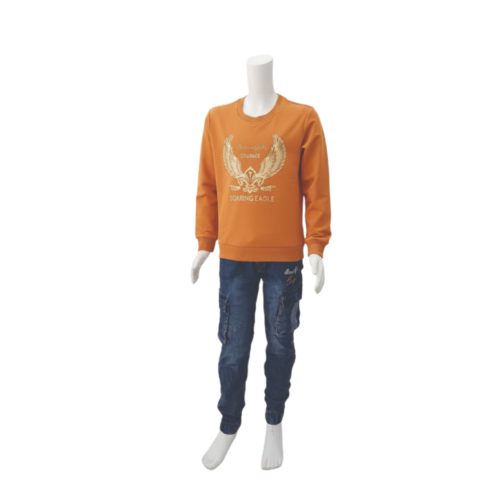 الطقم يتميز بالجمع بين الأناقة العصرية والعملية اليومية، حيث يبرز الطابع الجرافيكي الجريء للكنزة ذات طبعة النسر الذهبية على خلفية برتقالية دافئة، ويكملها بنطلون جينز كارغو قوي بقصة الجوغر المرنة لضمان الراحة وحرية الحركة