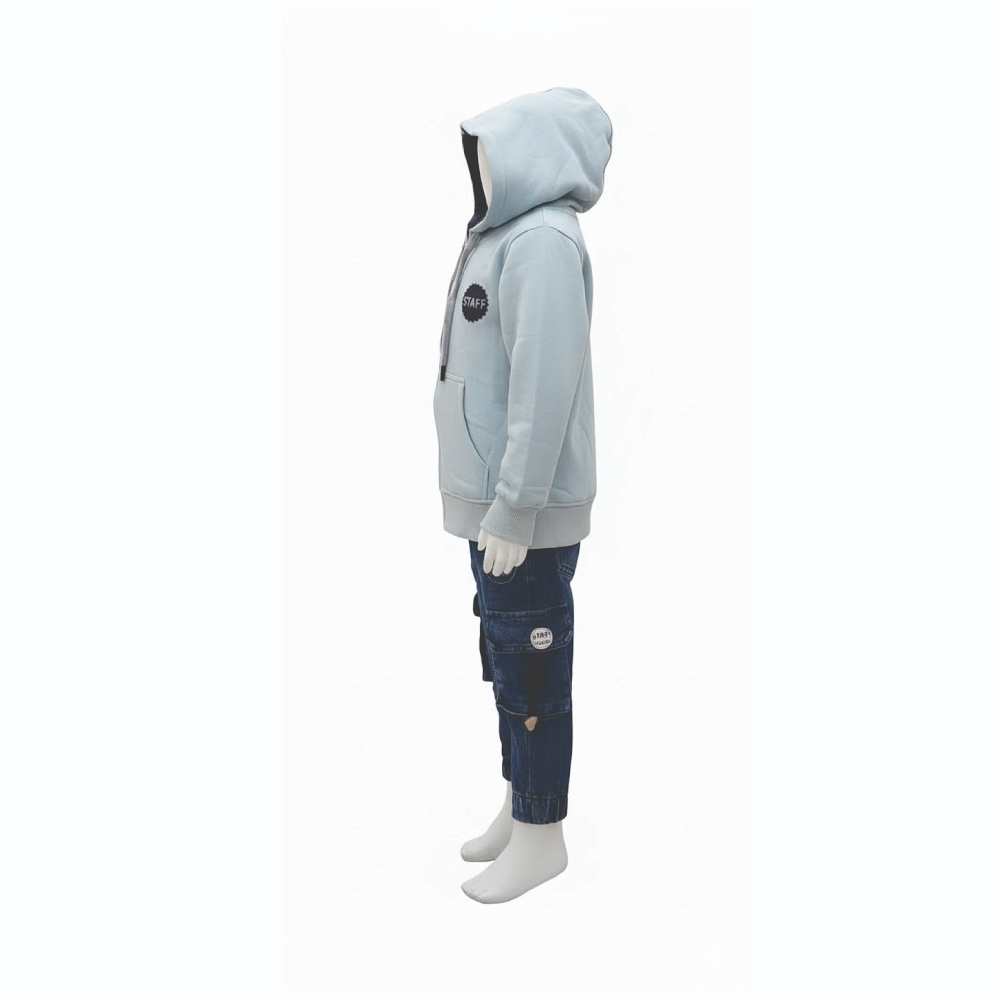الجاكيت بقبعة وسحاب كامل بلون أزرق سماوي فاتح و يتميز بتفاصيل متباينة والبنطلون بلون جينز كحلي داكن ذو قصة واسعة وعملية. يتميز بجيوب جانبية كبيرة وتفاصيل أربطة تزيد من مظهره الحاد |
