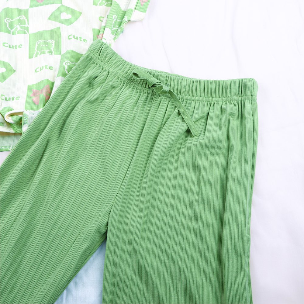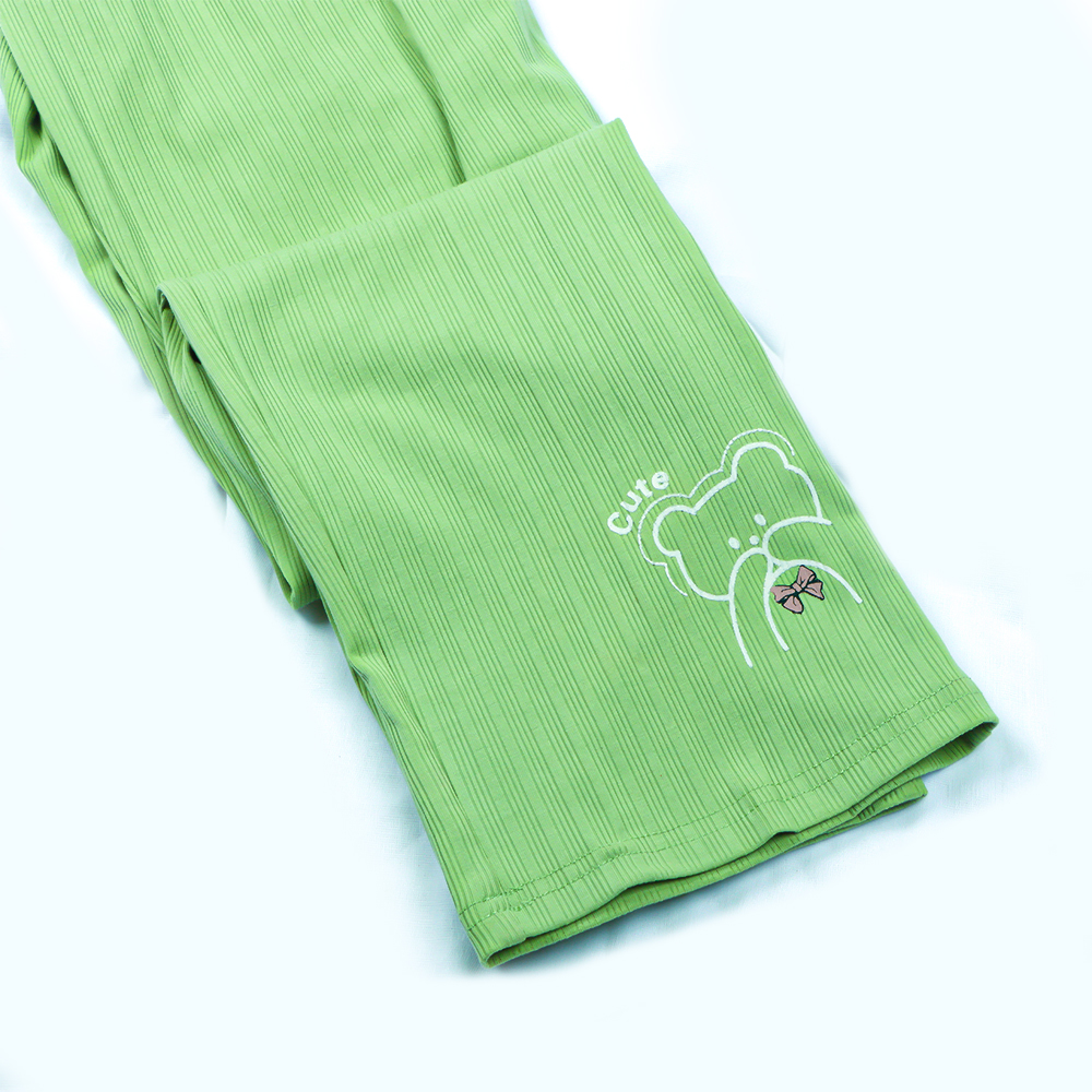 تيشيرت بطبعات طفولية مرحة (دب، قلوب، فيونكة) مع ربطة سفلية، وبنطال بخصر مطاطي بلون أخضر متناسق |