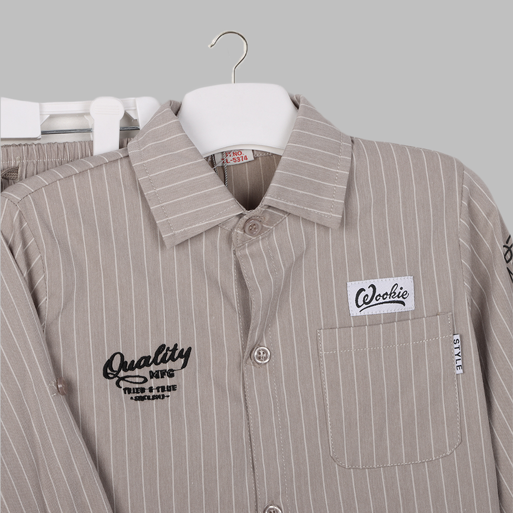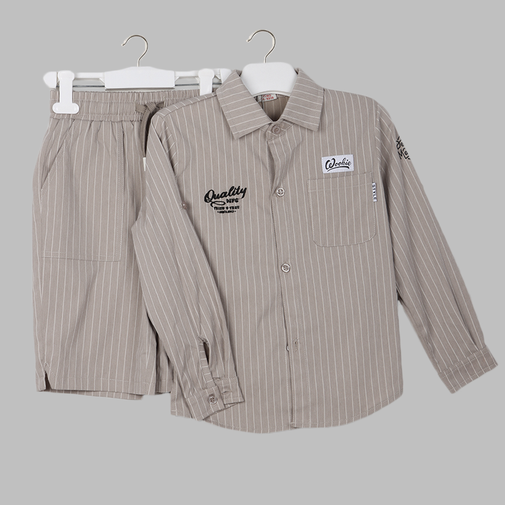 طقم أنيق يتكون من قميص بأكمام طويلة مع ياقة كلاسيكية وأزرار أمامية، مزين بطبعات كتابية عصرية، مع شورت بخصر مطاطي لراحة أفضل. تصميم مخطط رفيع بلون حيادي يمنح إطلالة مرتبة وعصري |