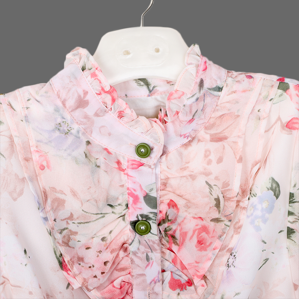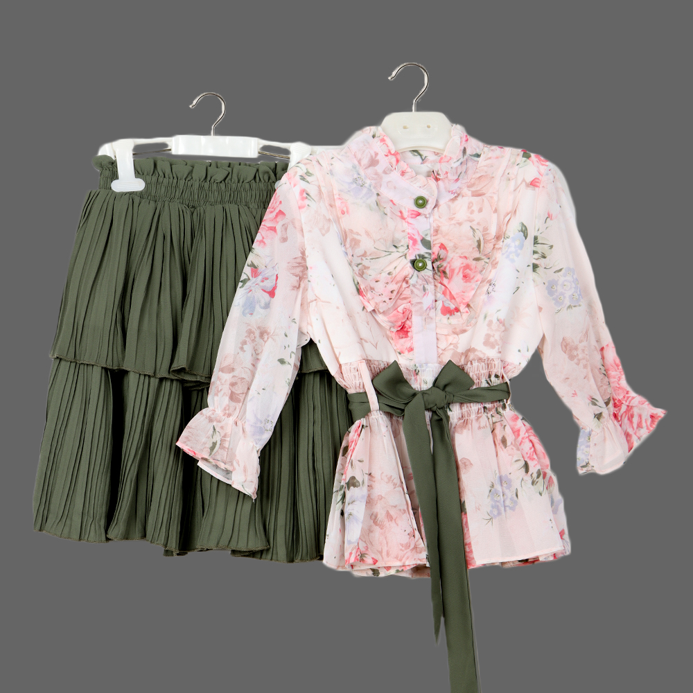 بلوزة مزخرفة بنقشة زهور ناعمة مع كشكش أمامي وحزام قابل للربط، وتنورة بتصميم طبقات وانسيابي |