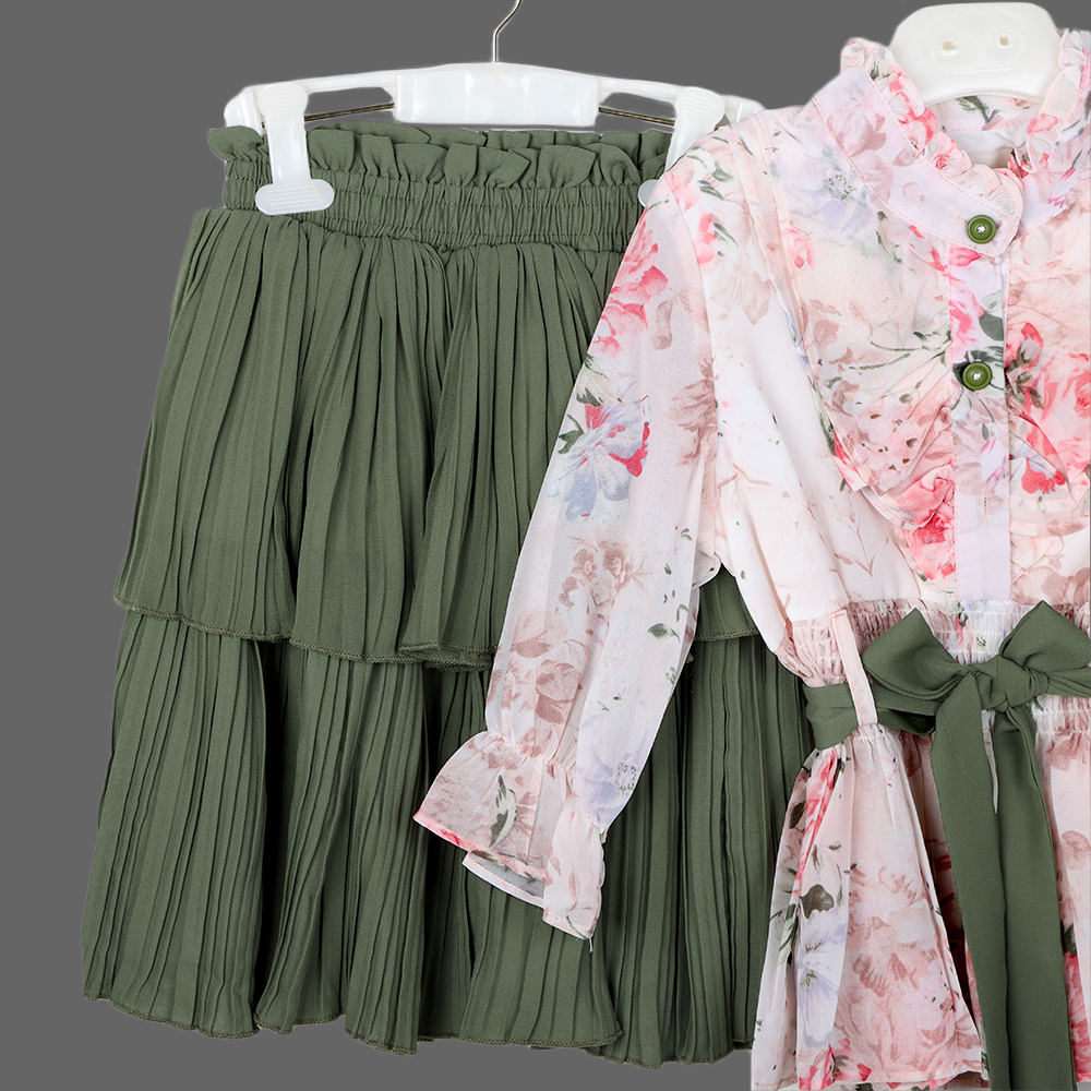 طقم أنثوي راقٍ يجمع بين الرقة والأناقة، بتفاصيل ناعمة وألوان متناغمة تمنح الطفلة إطلالة مميزة وناعمة