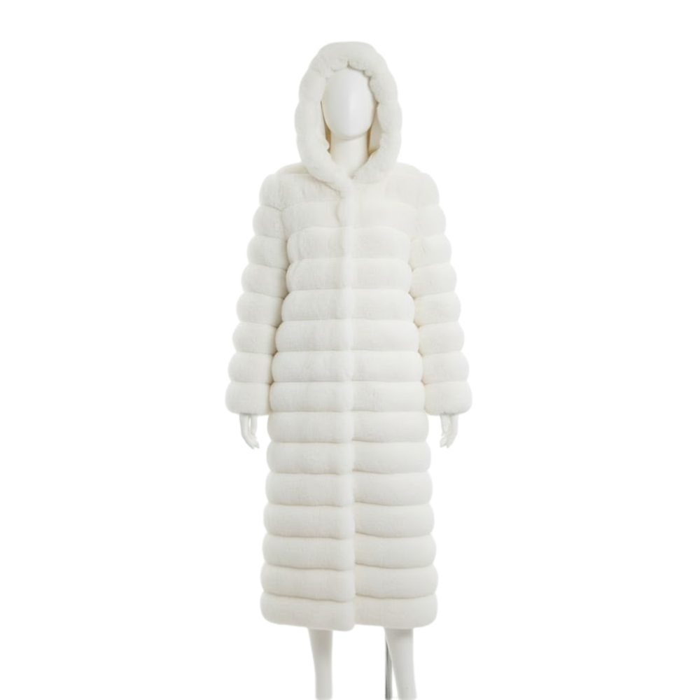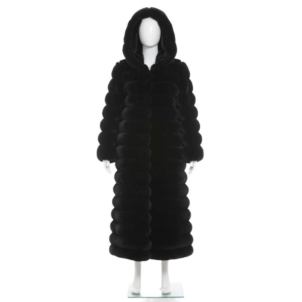 جاكت بمظهر فخم وعصري طويل يغطي الجسد، مما يعطيه طابعاً كلاسيكياً راقياً. يعتمد التصميم البصري على نمط "الطبقات المتكررة" أو الحلقات العرضية، مما يكسر رتابة المساحات الطويلة ويضيف عمقاً وتركيباً للمظهر العام. القلنسوة الكبيرة تضفي لمسة من الغموض والأناقة، وتكمل المظهر الضخم والمتناسق للمعطف.