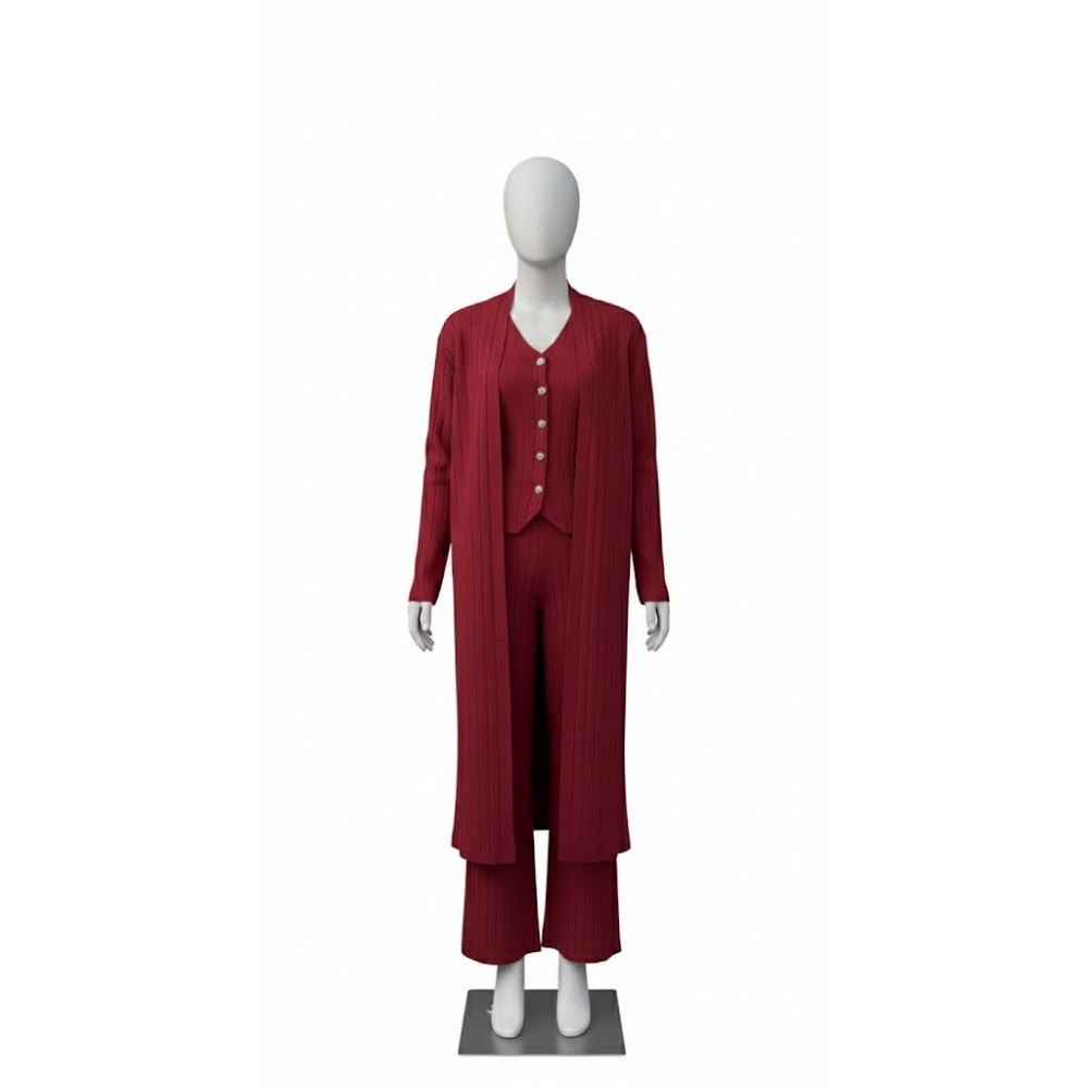 طقم نسائي يجمع بين الأناقة العصرية والراحة العملية، مما يجعله خياراً مثالياً للمرأة التي تبحث عن إطلالة متكاملة تتسم بالرقي والبساطة في آن واحد. يعكس المظهر العام للطقم تناغماً فريداً بين القطع الثلاث، حيث تمنح السترة الخارجية الطويلة لمسة من الوقار والانسيابية التي تضفي طولاً جمالياً على القوام. كما يوحي التصميم بالدفء والنعومة، مما يجعله ملائماً للأجواء الهادئة والمناسبات التي تتطلب مظهراً محتشماً ومهندماً. تبرز التفاصيل الدقيقة في التنسيق مدى الاهتمام بجعل الإطلالة تبدو فاخرة ومريحة في الوقت نفسه، حيث يسهل ارتداؤه في مختلف الأوقات اليومية. يتسم المظهر الخارجي بطابع الـ "مودرن كلاسيك" الذي لا يتأثر بمرور الزمن، موفراً مظهراً واثقاً وجذاباً دون الحاجة إلى مبالغة في الإضافات. هذا النوع من التنسيقات يعزز من حضور المرأة بأسلوب يجمع بين الترتيب العالي والسهولة في التنقل، مما يجعله قطعة أساسية في خزانة الملابس الراقية. يعطي الطقم انطباعاً بالجودة العالية والذوق الرفيع الذي يناسب مختلف الفئات العمرية التي تفضل التميز بهدوء.