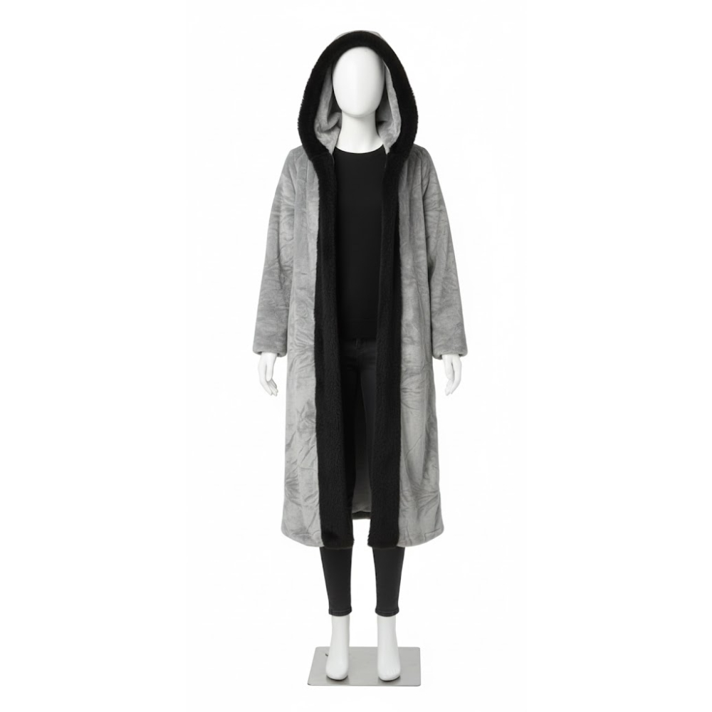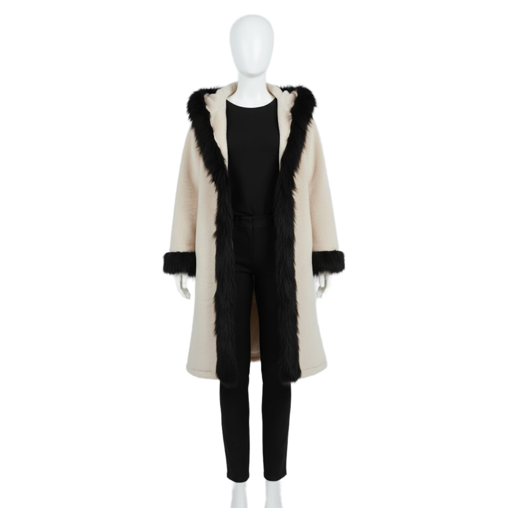 معطف نسائي بتصميم عصري وعملي يعتمد على تناغم الطبقات فوق بعضها البعض. يعكس الطقم إطلالة انسيابية ومنظمة بفضل تماثل الخامة في جميع القطع. يوحي التصميم بمزيج بين الأناقة والراحة، مما يجعله مناسباً للاستخدام اليومي أو بيئات العمل. يتمتع المظهر العام لهذه المعاطف بطابع ثقيل وفخم، حيث توحي الأجزاء المضافة من الفرو بالدفيء والرقي. يعتمد المظهر على التضاد البصري بين القماش الأساسي والحواف المحيطة بالياقة والأكمام. تعطي القصات الطويلة مظهراً وقوراً ومكتمل التفاصيل، يغني عن إضافة قطع إكسسوارات معقدة.