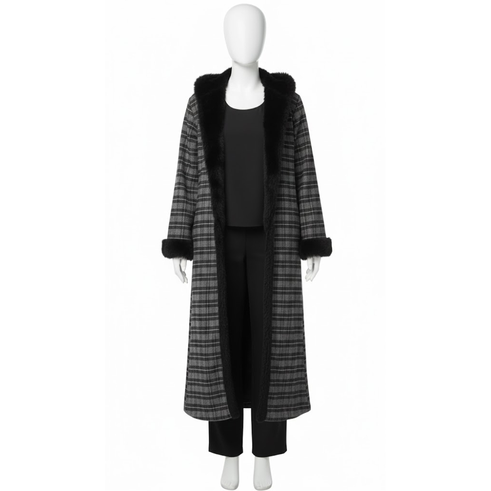 جاكت نسائي كلاسيكي يعتمد على نمط الخطوط الهندسية المتقاطعة التي تمنحه طابعاً كلاسيكياً رزيناً ومنظماً. يوحي المظهر بالدفء والرقي، مما يجعله خياراً مثالياً للمناسبات التي تتطلب إطلالة محافظة وأنيقة في آن واحد. يتميز المعطف بوجود طبقة كثيفة من الفراء الناعم التي تحيط بفتحة الرقبة وتمتد على طول الحواف الأمامية، مما يضفي لمسة من الترف والملمس الغني. تنتهي الأكمام بتفاصيل من نفس نوع الفراء المستخدم في الياقة، مما يخلق توازناً وتناغماً في تفاصيل القطعة. الجاكت مصمم ليكون طويل، مما يوفر حماية كاملة ومظهراً انسيابياً يمتد على كامل طول القامة.