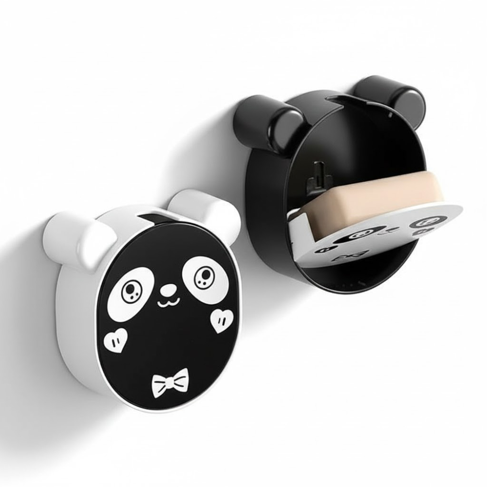 صندوق حامل صابون ذاتي التصريف يثبت على الحائط بتصميم باندا لطيف معلق مع غطاء قلاب للتصريف - ملصق سحري ذاتي اللصق للحمام والمطبخ وحوض الاستحمام