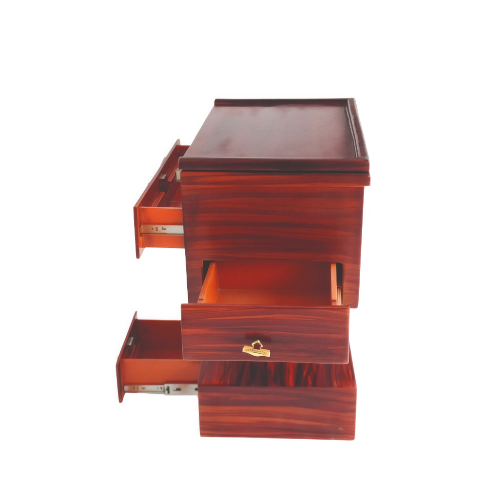 - تحتوي الطاولة على ثلاثة أدراج مفتوحة درج أمامي واسع في المنتصف ودرجان جانبيان أصغر حجماً يفتحان إلى الخارج