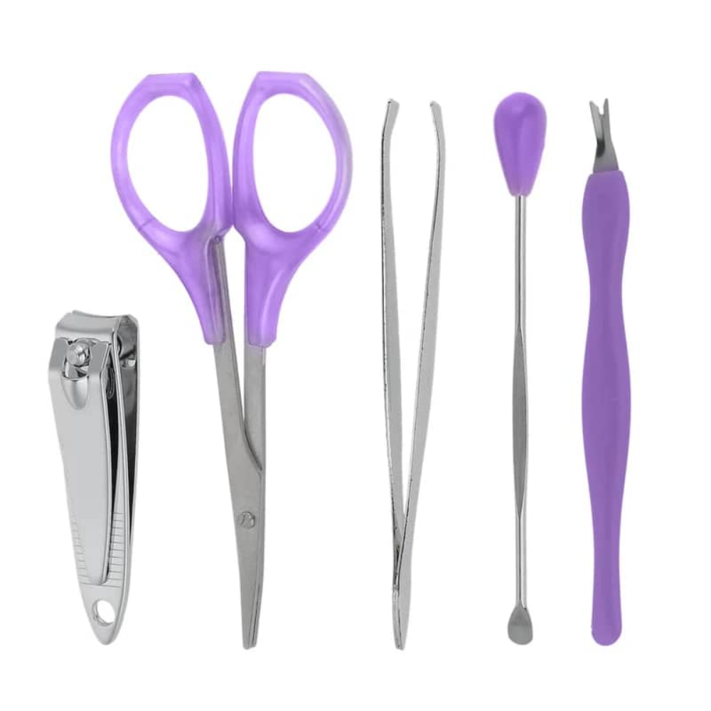 مجموعة أدوات العناية الشخصية والأظافر , مصنوعة من المعدن مع مقابض ملونة. تُستخدم المجموعة بشكل عام في تقليم الأظافر، تنظيف الجلد الزائد، وتشذيب الحواجب، وهي مصممة لتكون خفيفة الوزن وسهلة الحمل للاستخدام اليومي أو أثناء السفر.