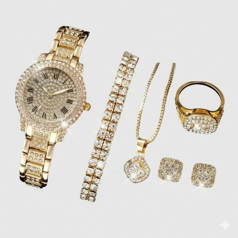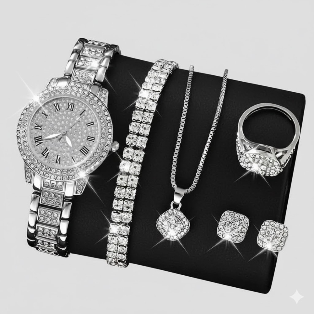 إكسسوارات نسائية فاخرة، تتميز بتصميم موحد يعتمد على الترصيع الكثيف بفصوص الكريستال البراقة. الطقم مصمم ليعطي بريقاً لافتاً في المناسبات، ويجمع بين الأناقة الكلاسيكية والمظهر العصري "المودرن" من خلال تنسيق الساعة مع المجوهرات.