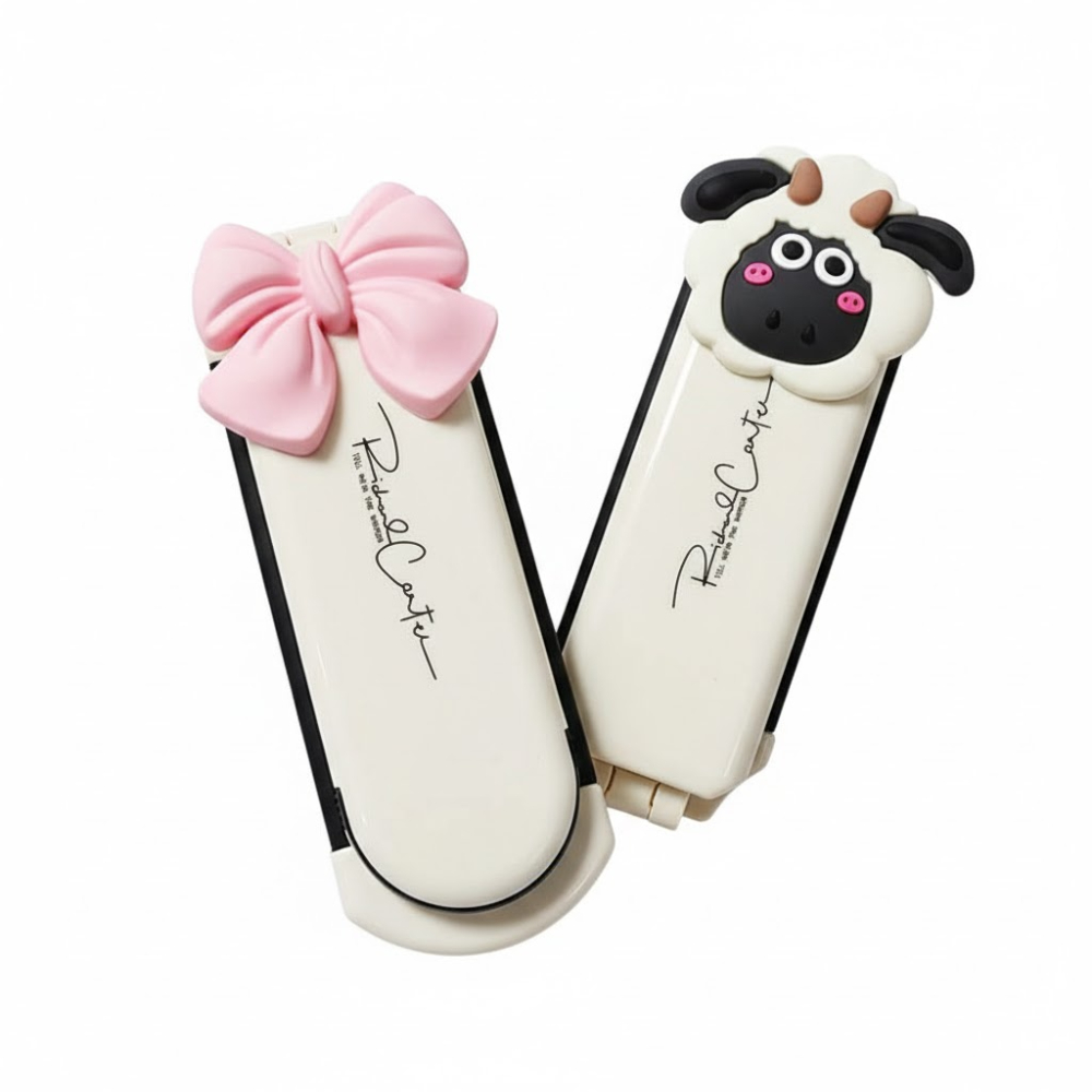 أداة تجميل مدمجة تجمع بين فرشاة ومرآة في تصميم واحد قابل للطي، مزينة بأشكال كرتونية لطيفة لتناسب الحقيبة اليدوية.