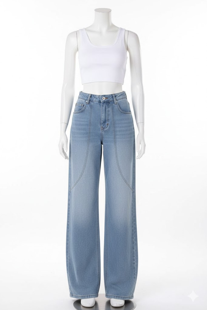 بنطلون جينز نسائي عصري، مصمم بأسلوب يجمع بين الراحة والأناقة. يتميز بلمسات جمالية غير تقليدية في القماش، مما يجعله قطعة مميزة تتماشى مع صيحات الموضة الحديثة والإطلالات اليومية الكاجوال.