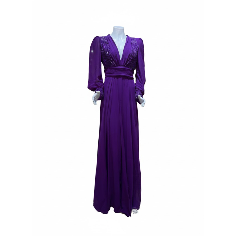 فستان سهرة طويل وفخم مودرن ، يتميز بتصميم كلاسيكي أنيق يجمع بين القماش المنسدل والتطريز اللامع، مع أكمام طويلة وقصة تبرز خصر الجسم