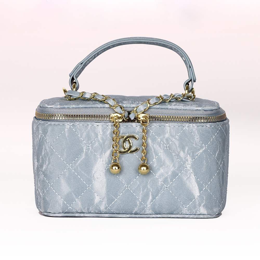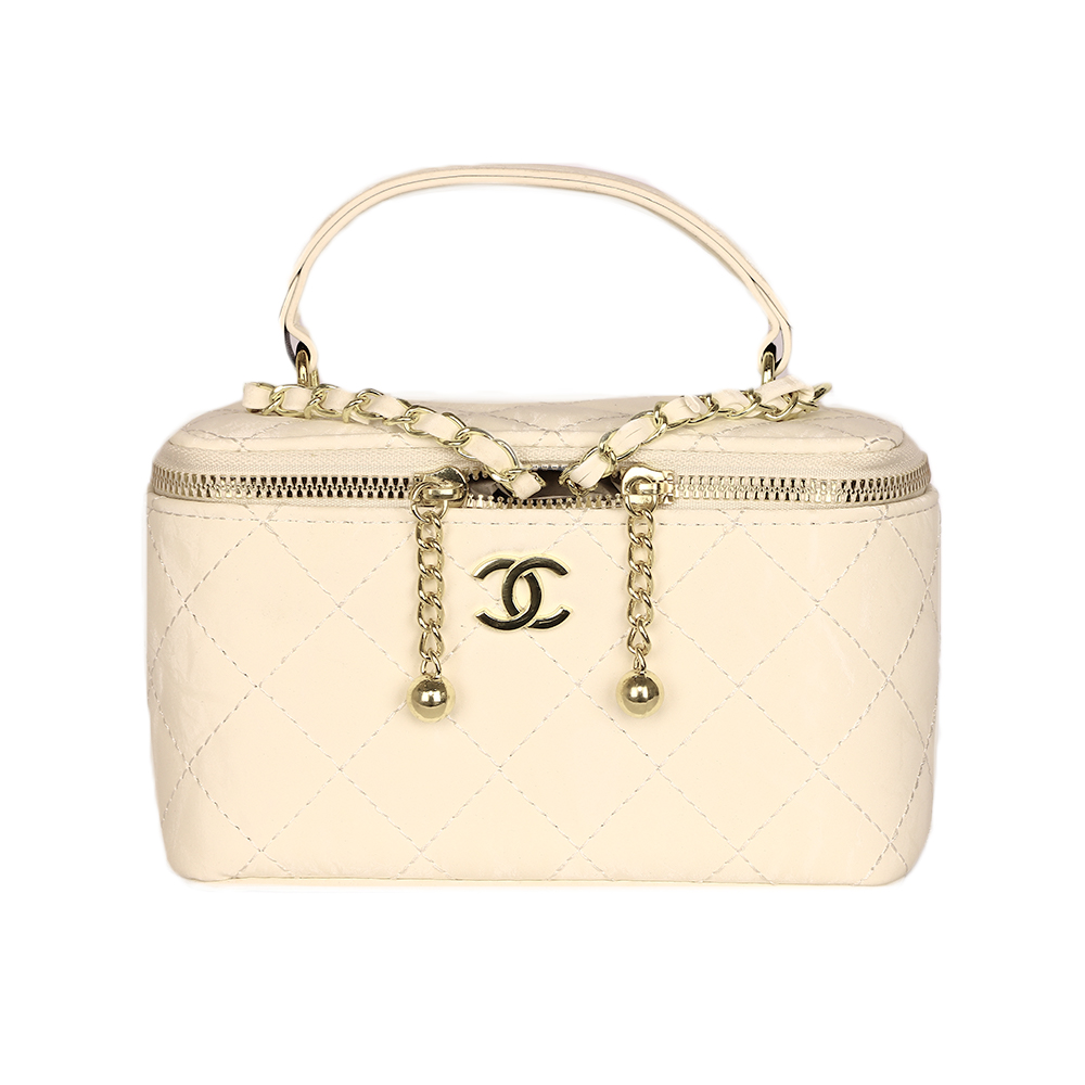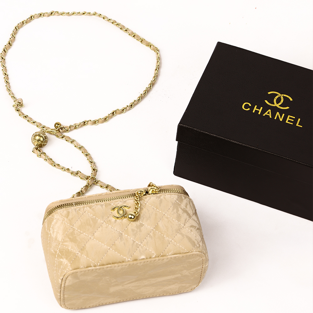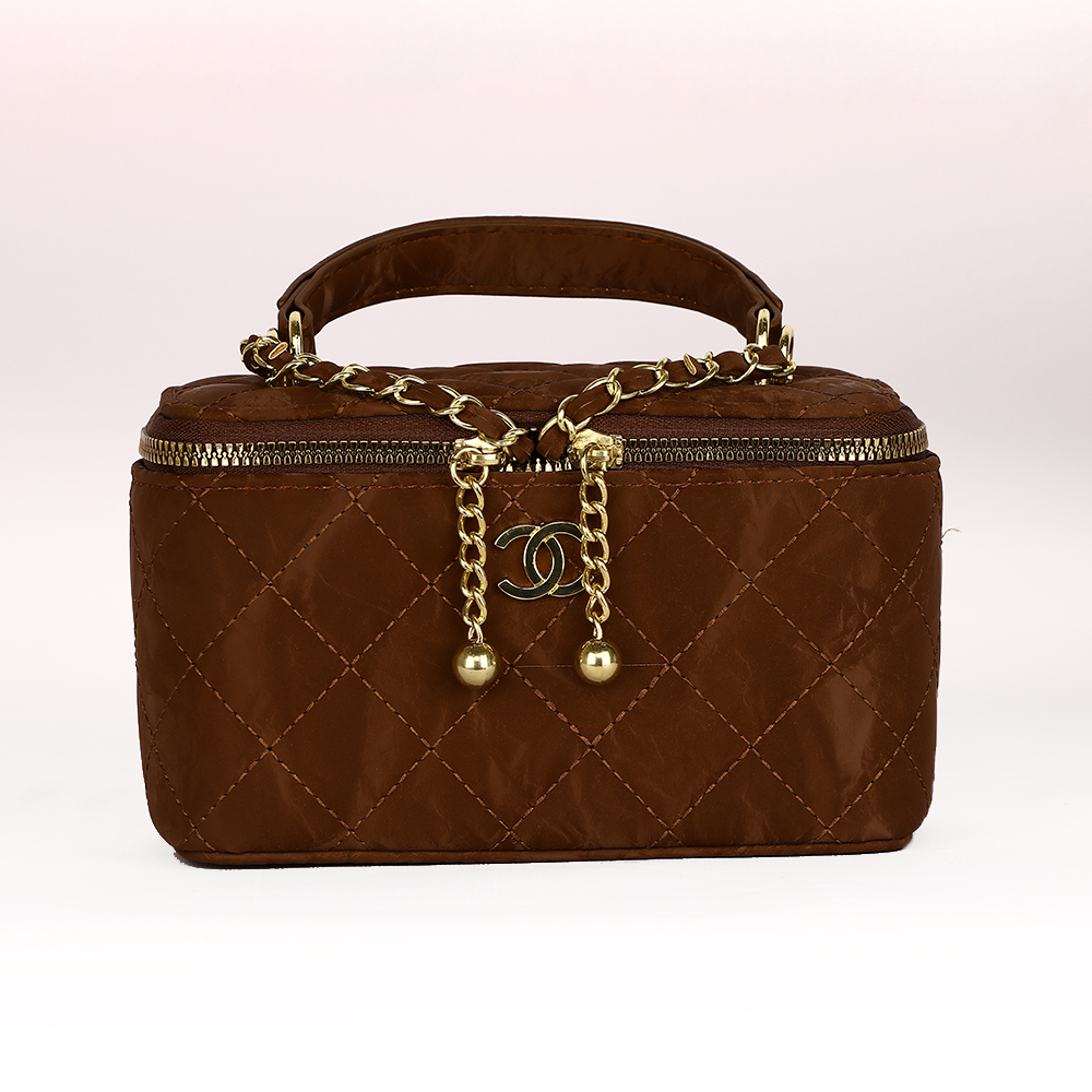 حقيبة صغيرة بتصميم مستطيل مبطّن بنقشة مربعات أنيقة، مزودة بسحاب علوي للإغلاق الآمن، مع يد علوية مريحة للحمل وسلسلة معدنية ذهبية تضيف لمسة فاخرة. مزينة بتفاصيل معدنية أنيقة في الواجهة تمنحها طابعًا راقيًا وجذابًا.