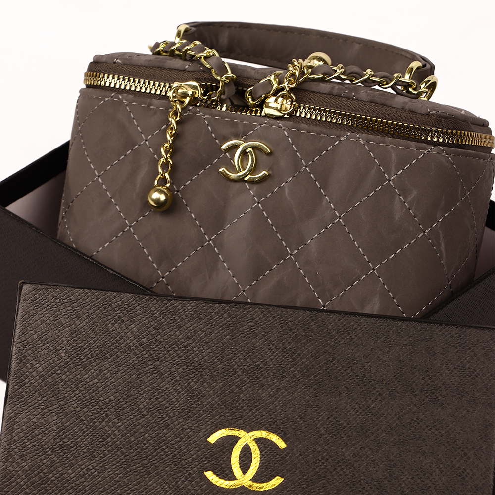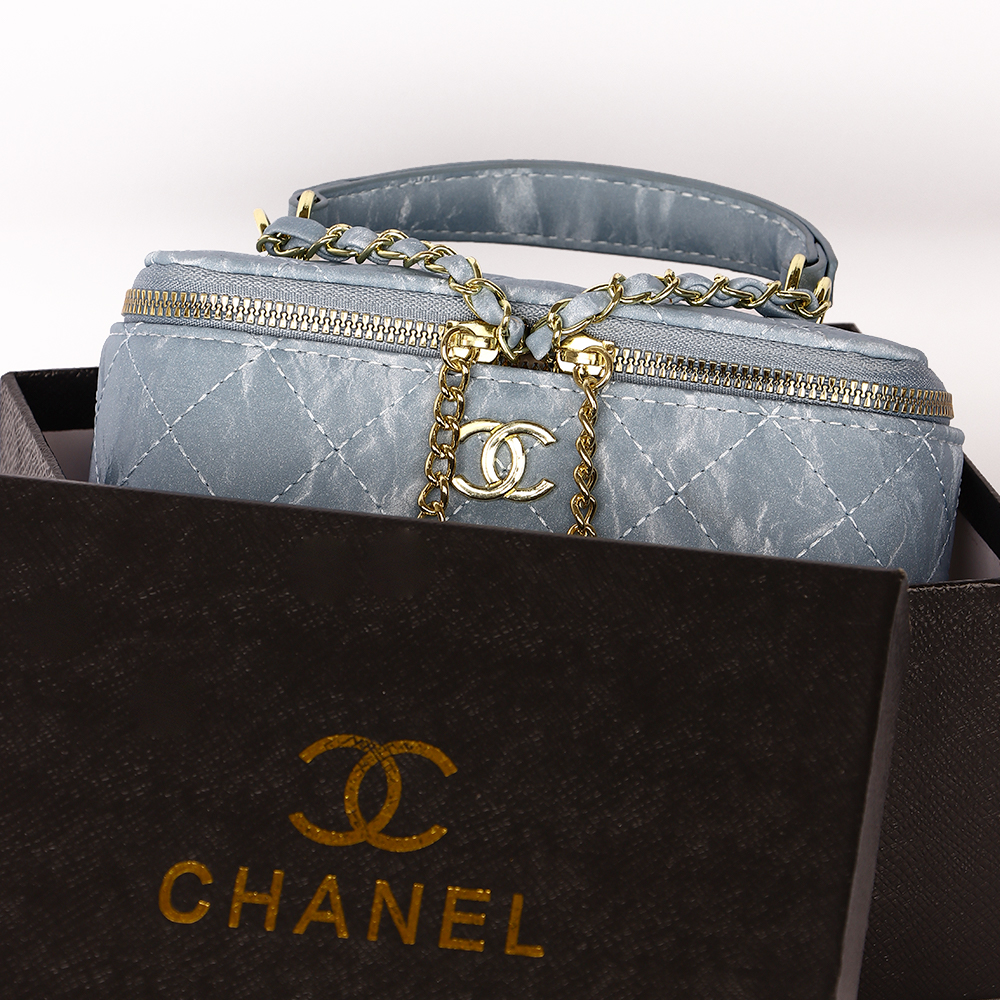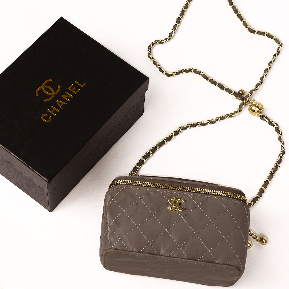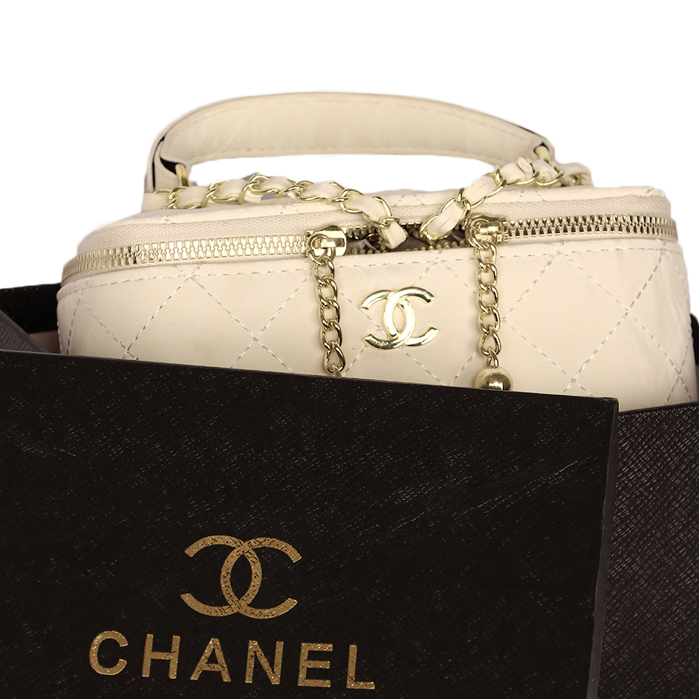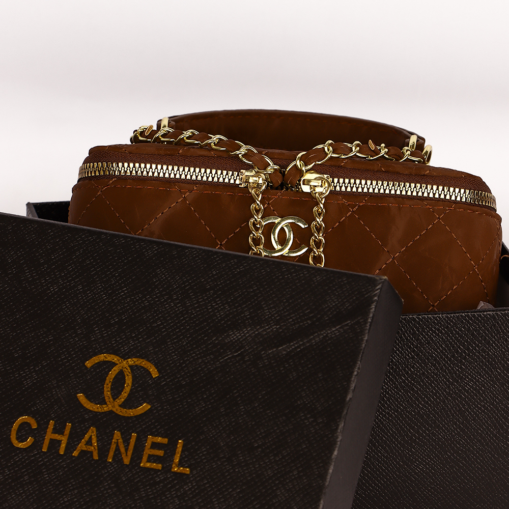 حقيبة صغيرة بتصميم مستطيل مبطّن بنقشة مربعات أنيقة، مزودة بسحاب علوي للإغلاق الآمن، مع يد علوية مريحة للحمل وسلسلة معدنية ذهبية تضيف لمسة فاخرة. مزينة بتفاصيل معدنية أنيقة في الواجهة تمنحها طابعًا راقيًا وجذابًا.